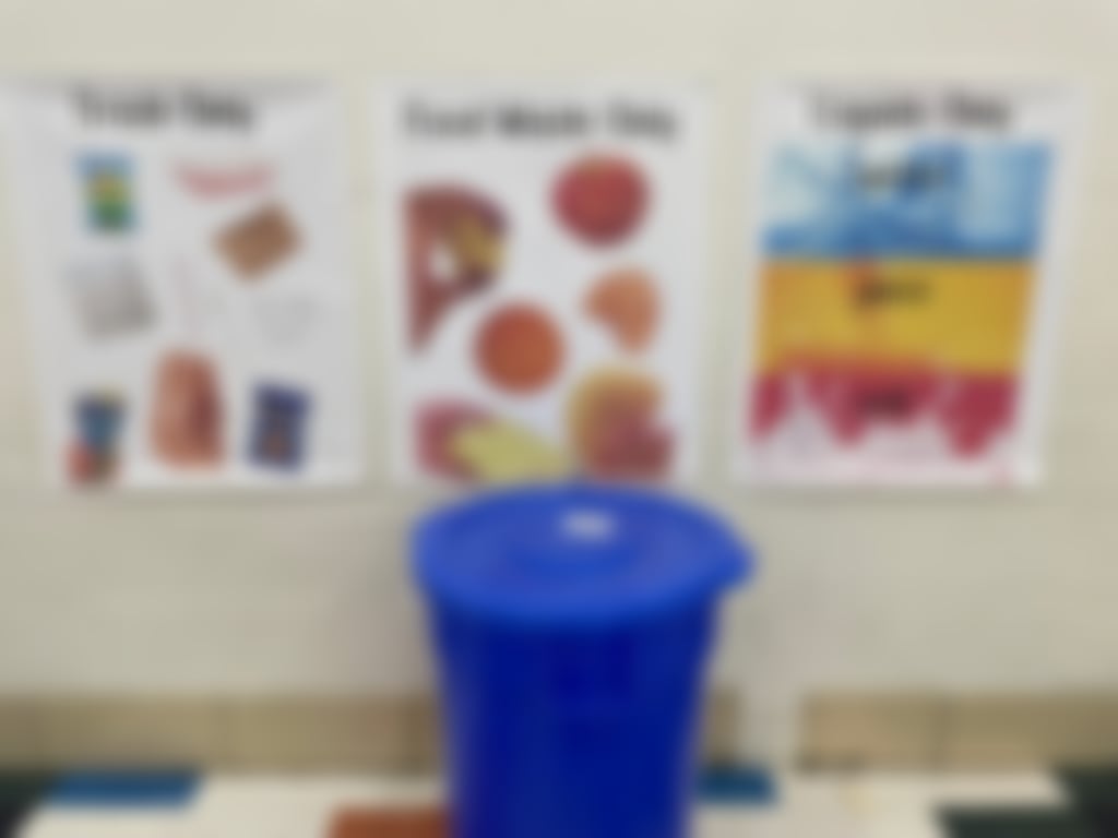 These posters remind the students of where to place trash, food waste, and liquids. There are three separate bins in the cafeteria. The students place trash in one. Food waste is placed in another and all liquids in a third bin.