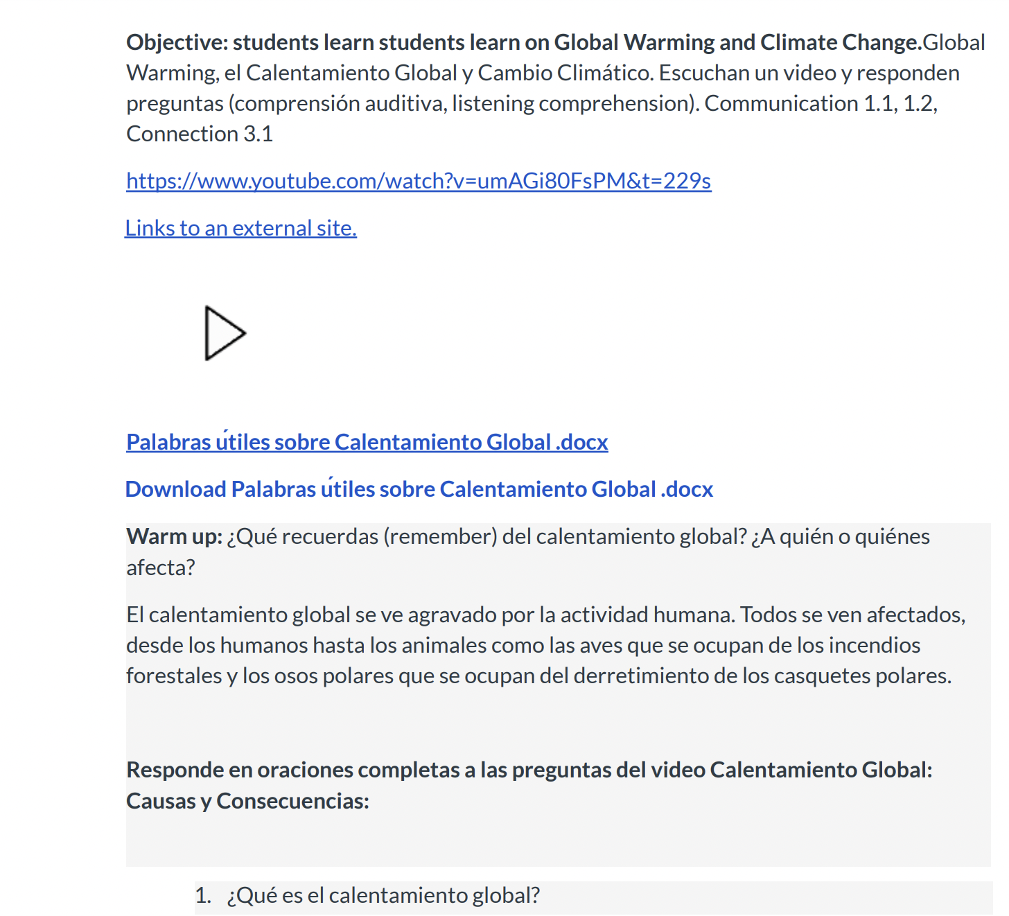 Mr. Sor talked about Climate change in his IB Spanish class and its issues concerning globally. The entire lesson was based on climate change. The students had to listen to the audio and write about it. They had an engagement question based on it .heir classwork assignment was also on the issues of climate change.