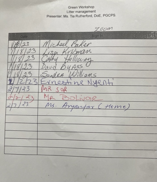 For the staff of 50 members, we had the Litter management workshop from the DoE, PG County. Ms. Tiaa Rutherford was the presenter. A Zoom meeting was conducted during the Department meetings. Jan 18-Feb 8,2023
