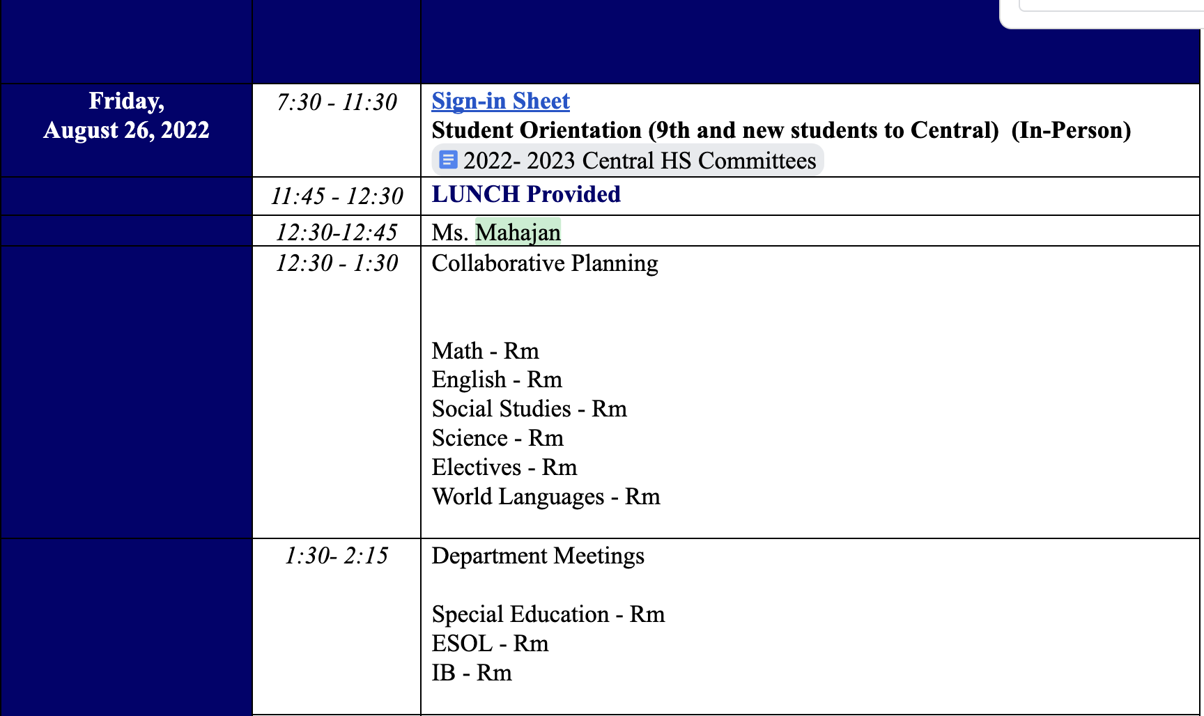 At the pre-service staff meeting in the beginning of the school year, introduction to the Green school and the certification process was discussed. mrs. Mahajan talked about Central HS being a Green School and how sharing Green Team s work would be a part of evidence for the recertification process.