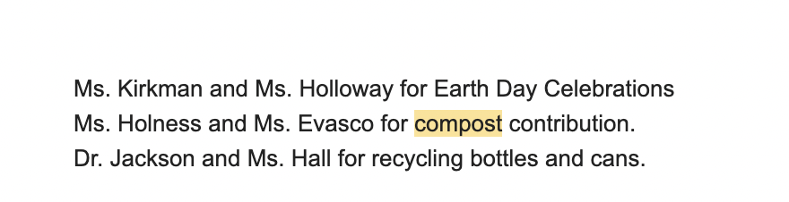 Compost. We have a school garden and the staff members contribute towards it. they bring their compost from home and dump it in the garden compost. They were appreciated on the Green News and celebrations.