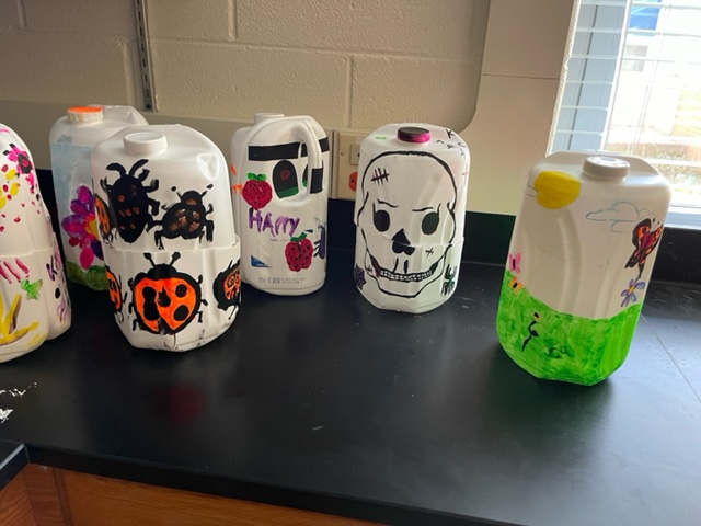 Ms. Holloway guided the ART students to recycle milk cans and convert them into planter pots. The students painted the cans and these were later used in the Farmer's market by the Green team. The cans represented the students' own design and creativity towards Nature. These can were created by her Special needs students.
