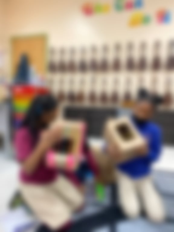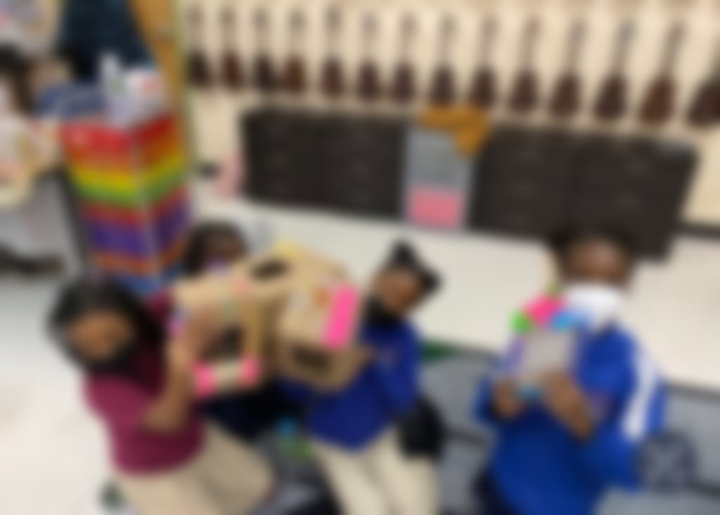In Music Class students studied vibrations, resonance, and all that's needed to make different instruments "play". Parents donated old materials to be reused for a STEM project. Each student created an instrument entirely of their own design! Students learned how to repurpose materials.
