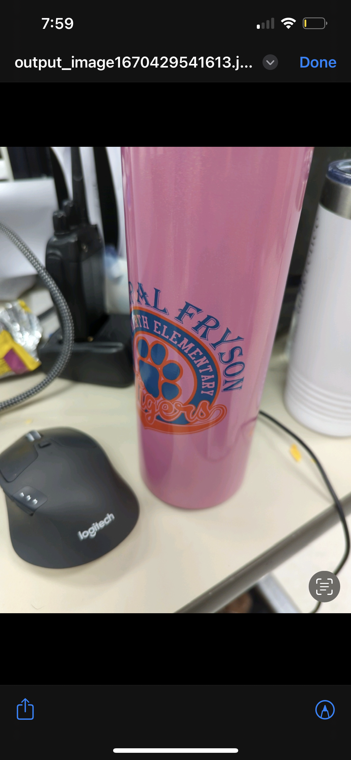Staff and students create reusable water bottles. Staff and students can design and create their own custom bottles. Students work together to create cool designs and then print them and sublimate them on their bottles. This was a design they made for our principal.