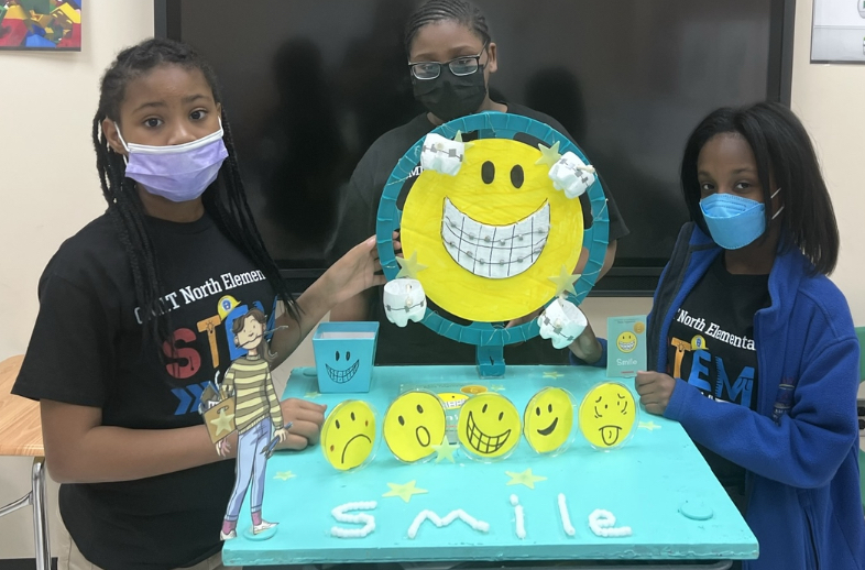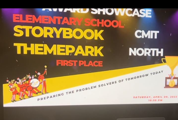 Student’s participation in a serious of STEM challenges. For the storybook Themepark ride they have to create an amusement park ride that is-made of 50 % recycled materials. They selected the book Smile. They won first place in the regional competition.