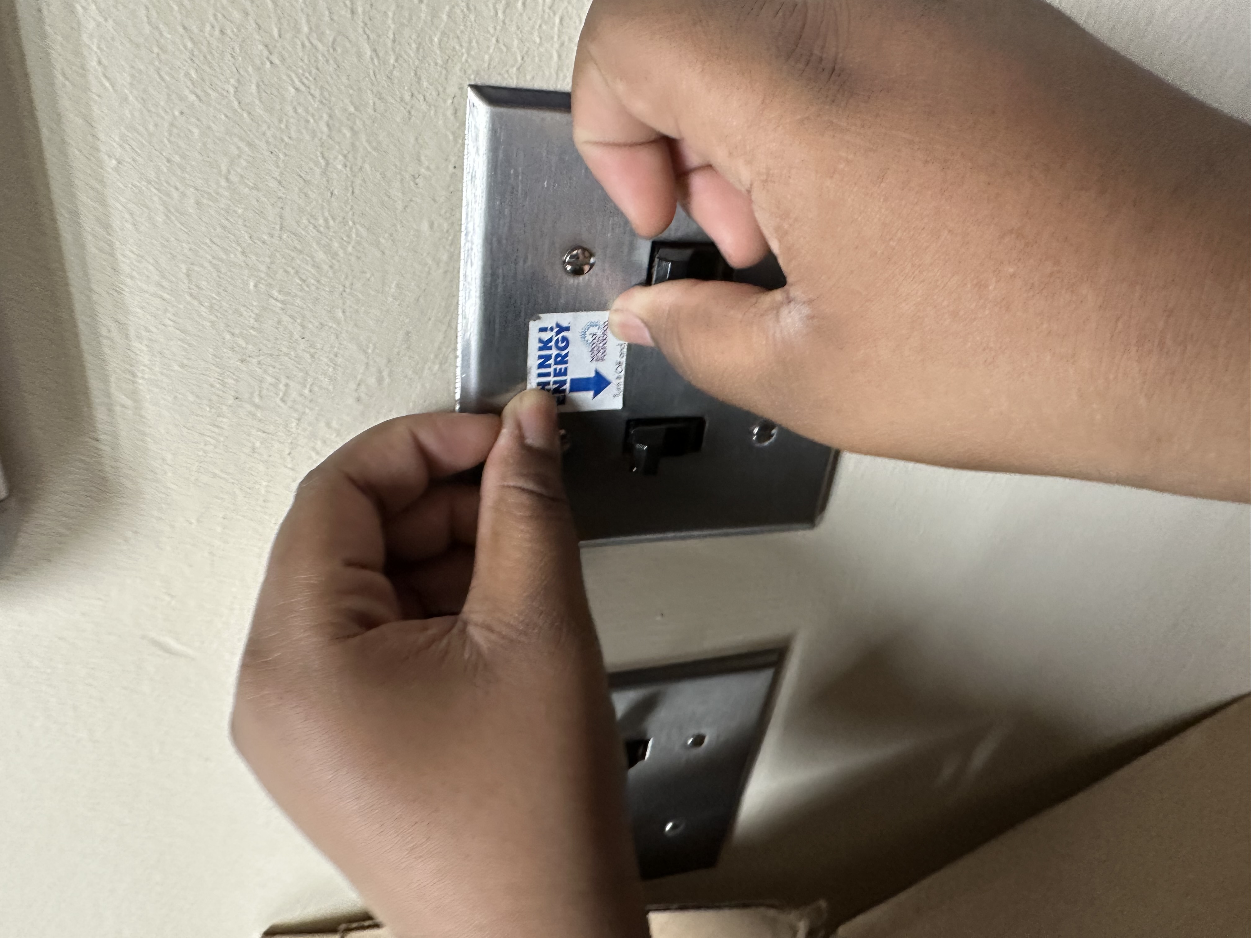 Students putting up signs to remind the school to turn the lights off when the room is not in use.