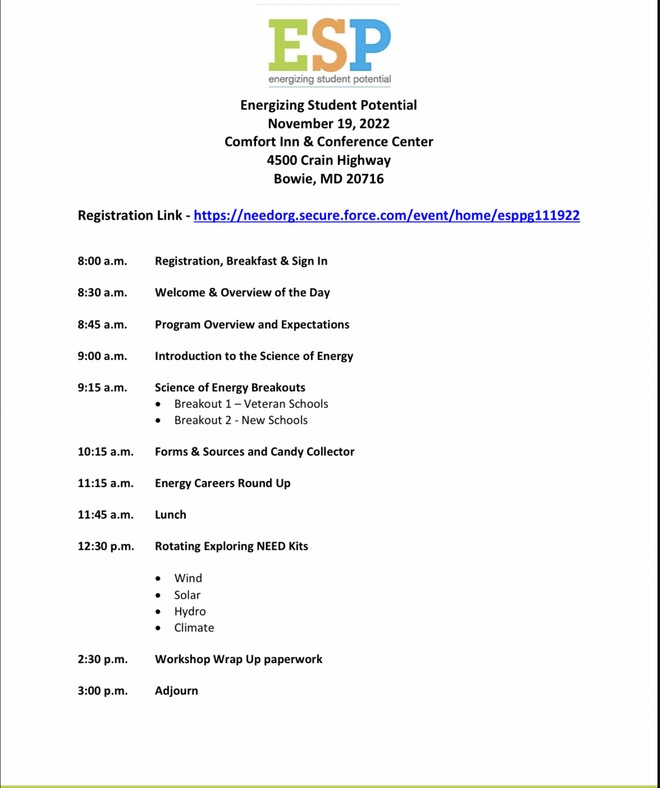 Energizing Students Potential training. This training provides training on ways to conserve energy. The training provides resources to teach students about energy conservation. The NEED program has grants for. the school to host energy fairs.