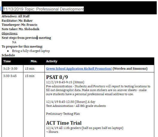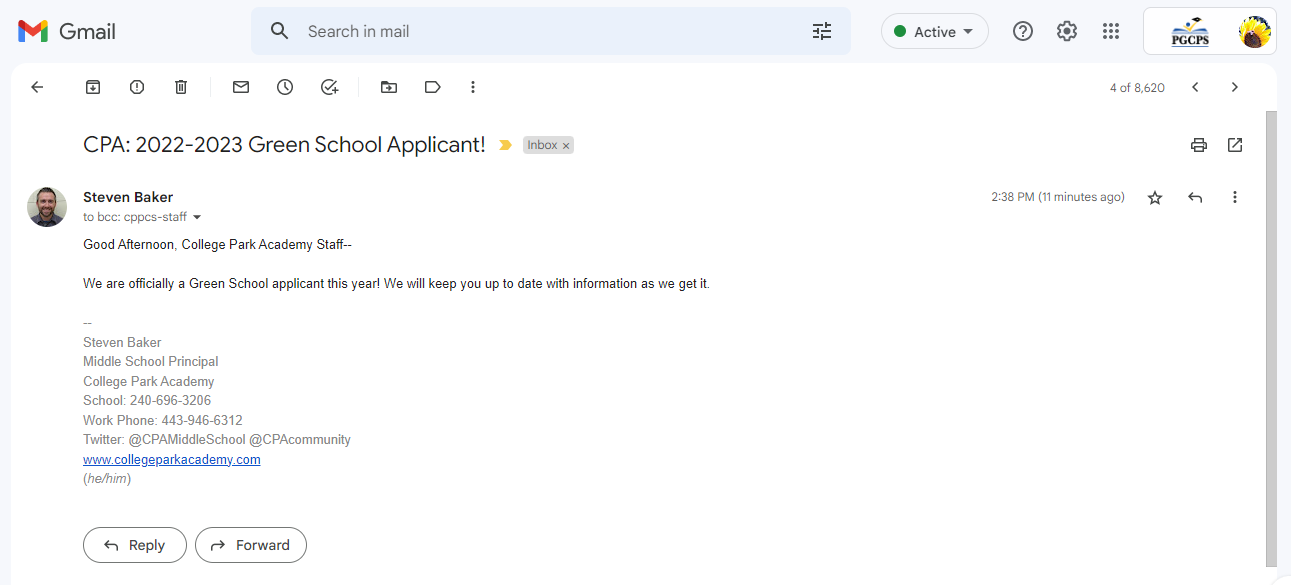 Email to all staff reminding all that College Park Academy is officially applying for Green School Certification this year. We started the process in 2019, when we first introduced the program at a whole-staff meeting.