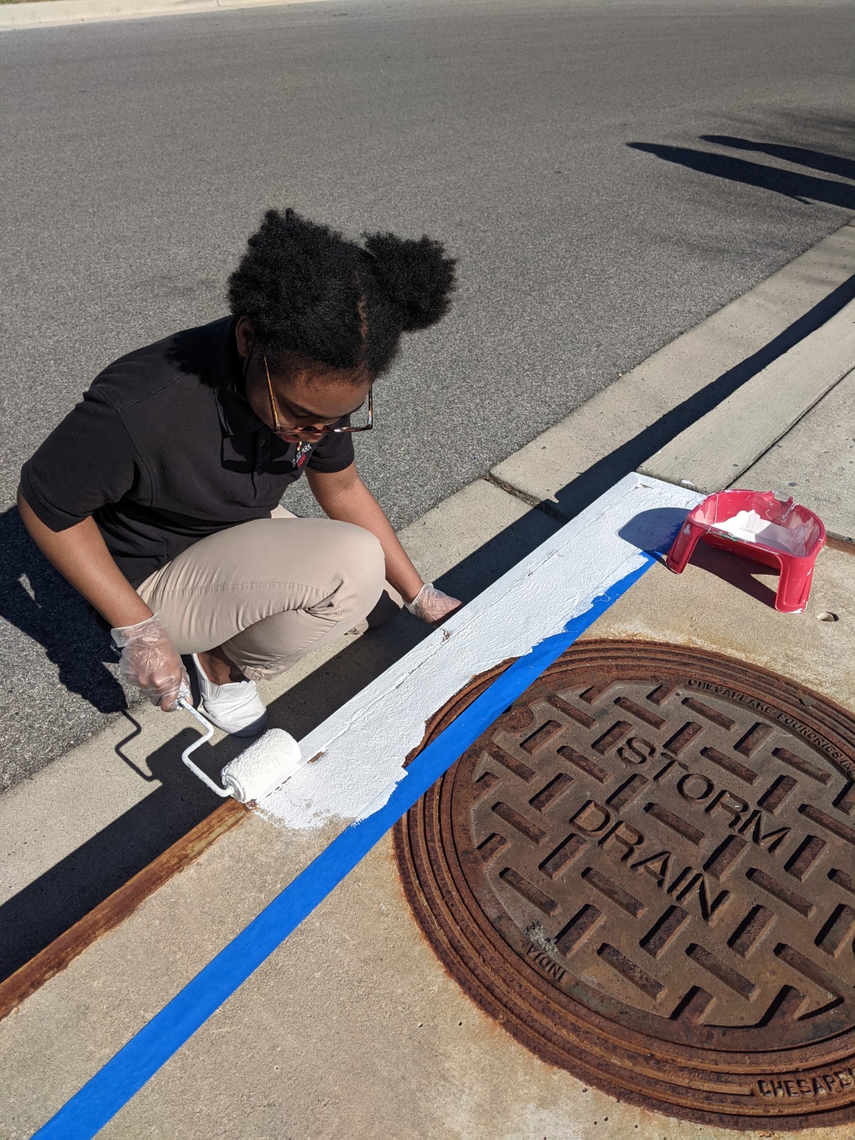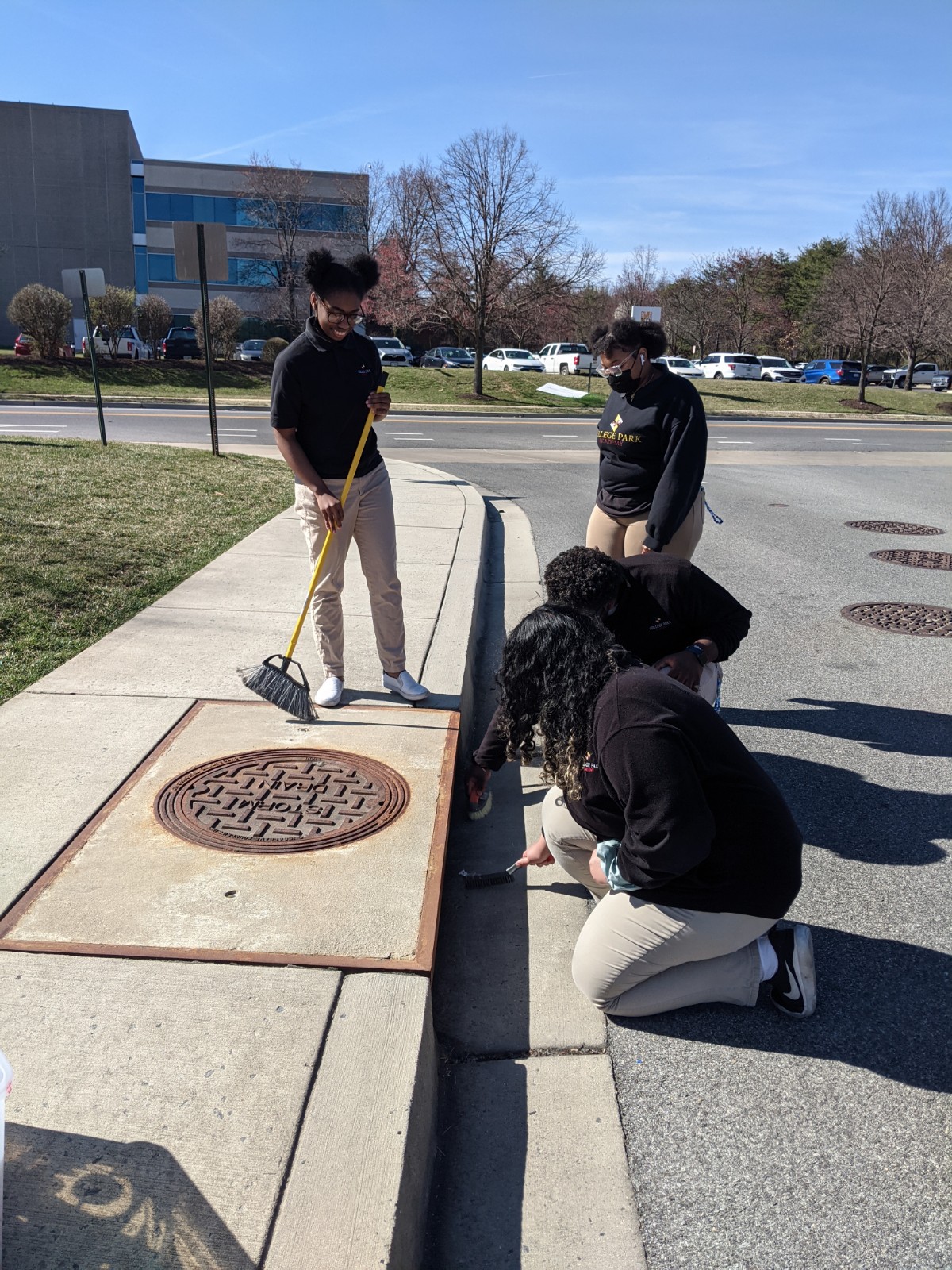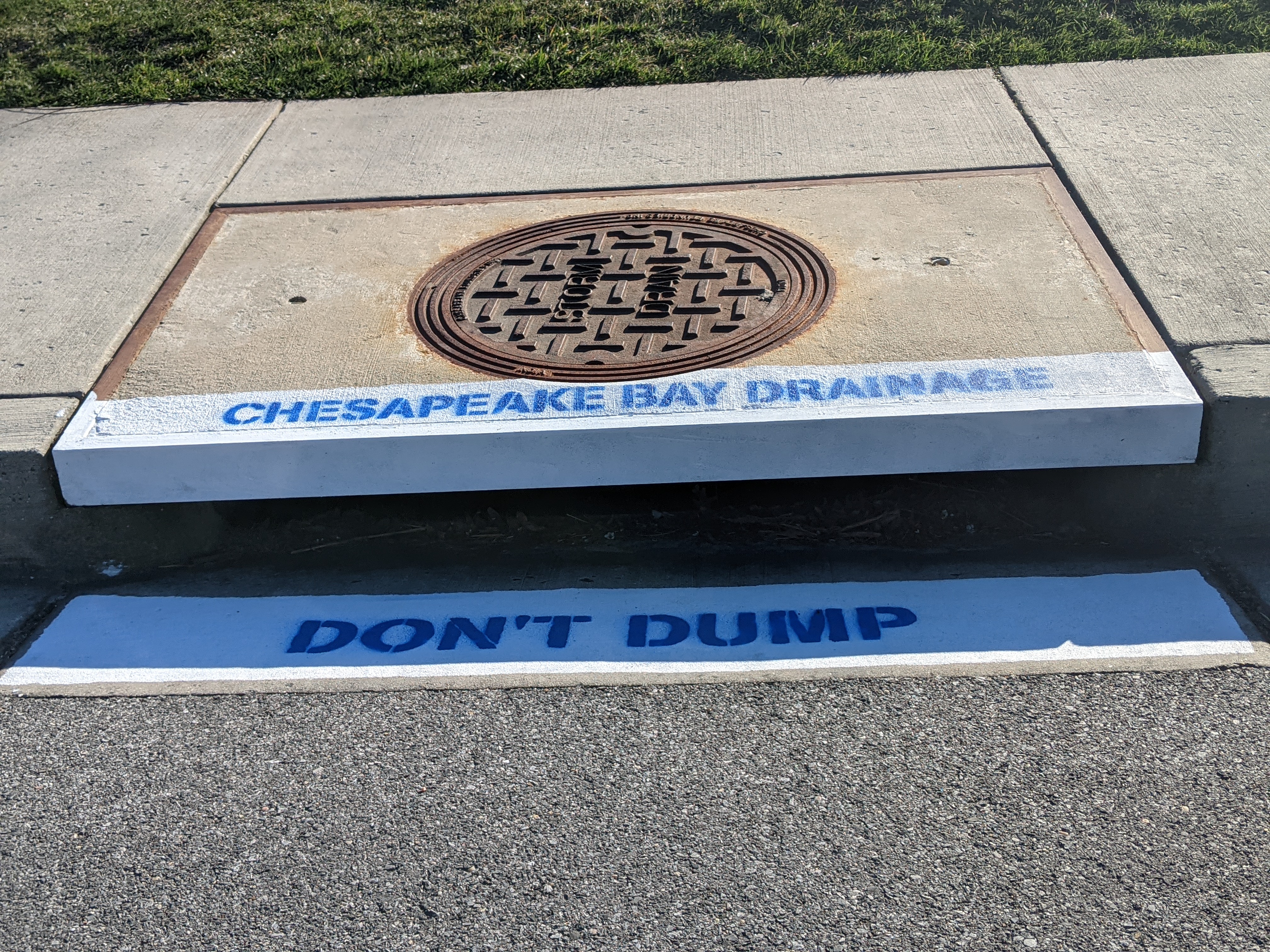 Students from the high school Environmental Club got their first experience with storm drain stenciling. The message is an important reminder that they flow directly into streams and other waterways. Rain will carry any trash or contaminants off the street and down the drain until eventually reaching the Chesapeake Bay.