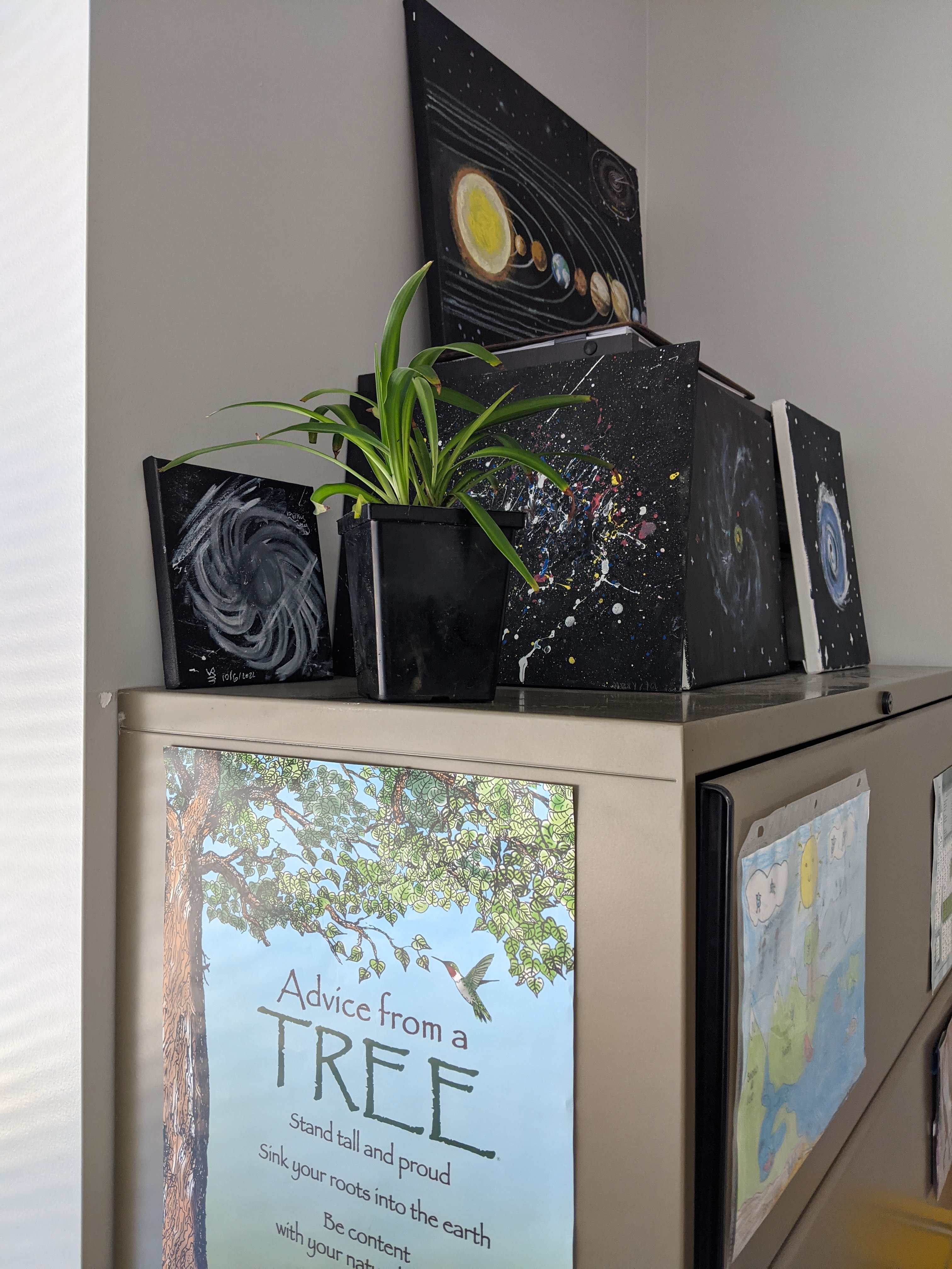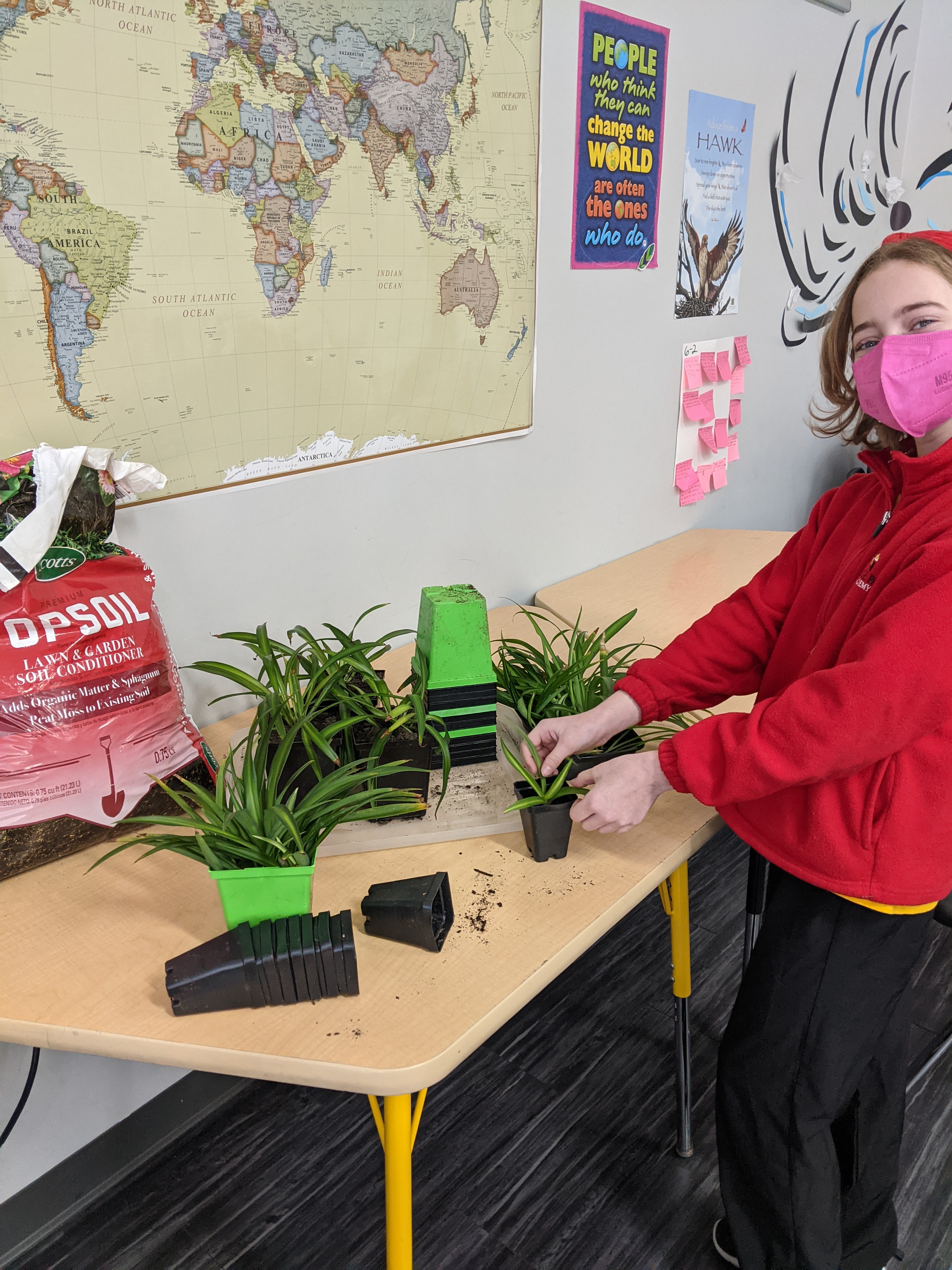 Students transplanted spider plants in order to promote better air quality in the classroom. Each classroom received a plant to care for during part of the school year.