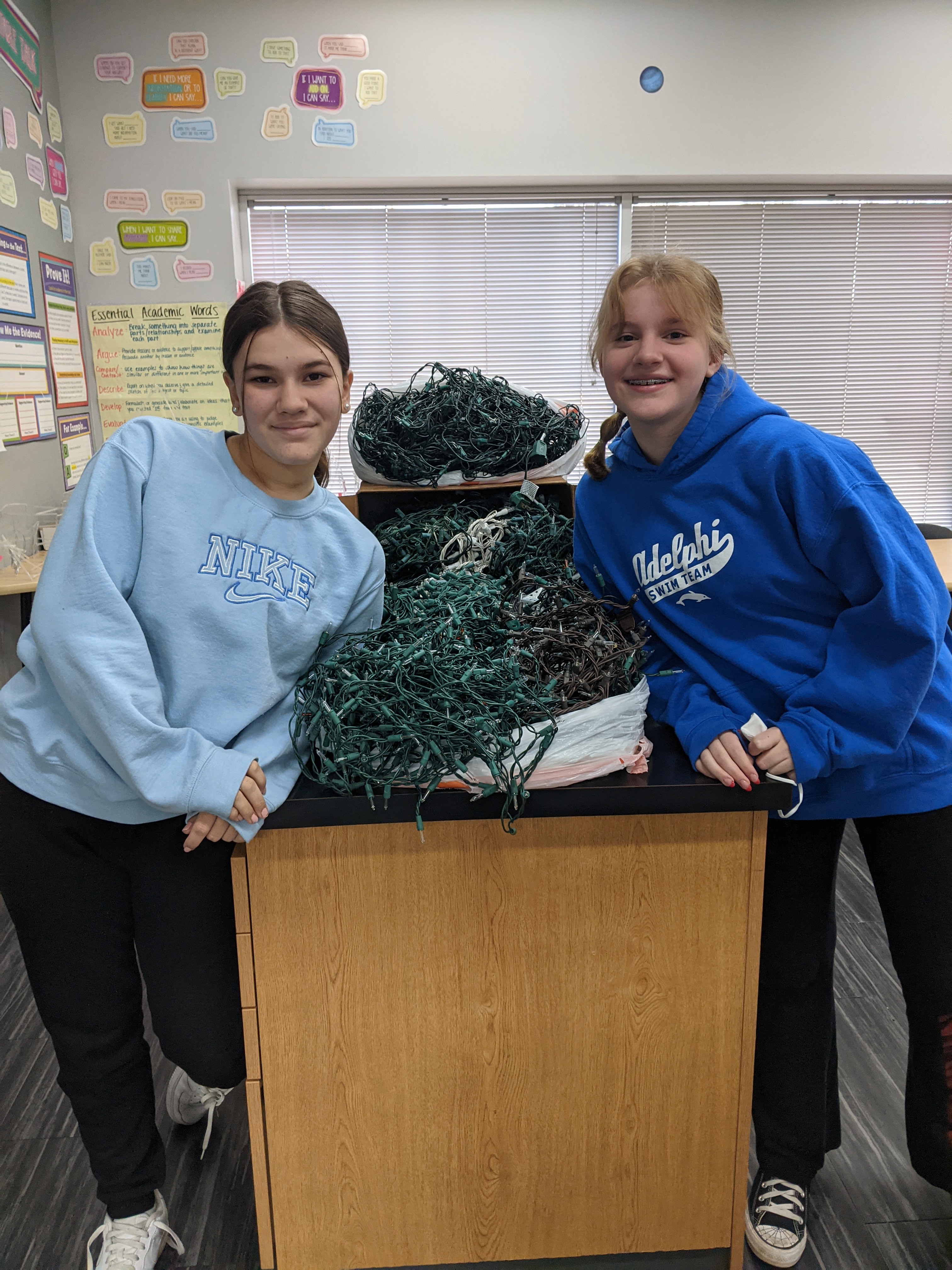 Middle School Environmental Club members collected broken and unwanted holiday light strings at school and from their neighbors. Announcements were sent to staff, students, and their families through our school virtual communication lines.