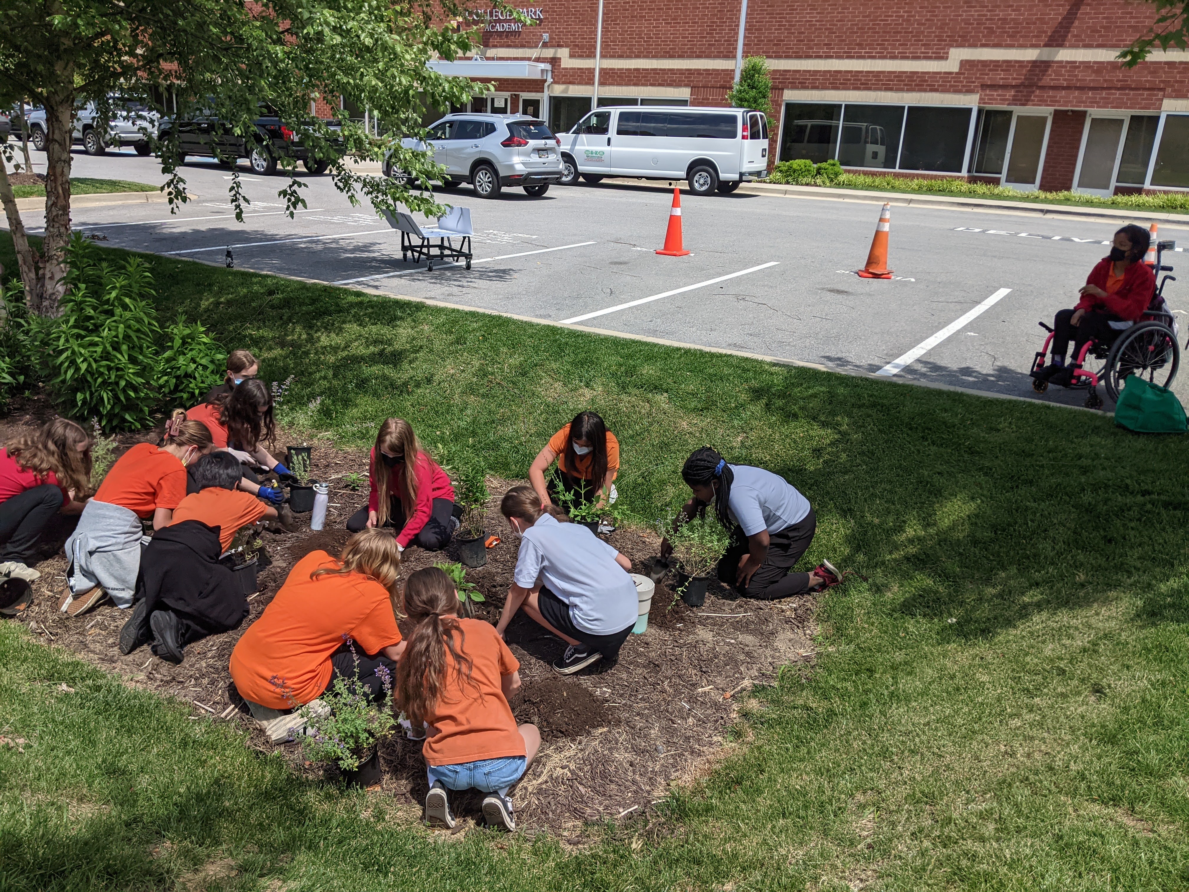 Students planted a pollinator garden on campus. Native plants and tools were provided by the Schmidt Center. Members of our middle school environmental club installed the plants in one of the dry stormwater detention ponds fronting our campus.
