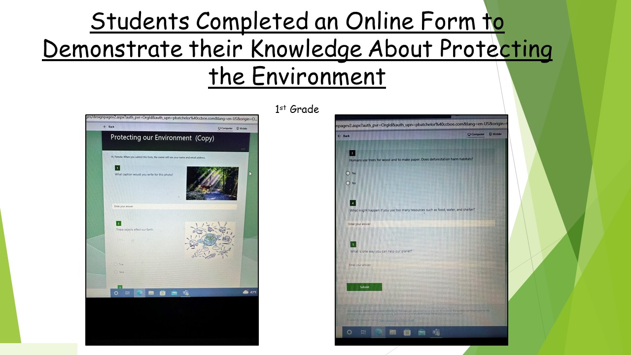 Students were introduced to the meaning of the word "protecting." Students discussed what effects the earth and what they can do to protect the earth. Students also discussed deforestations and what would happen if too many resources were used, such as food, water and resources to make a shelter. As an assessment students completed an online form instead of the traditional pencil paper to represent protecting our earth from pollution.
