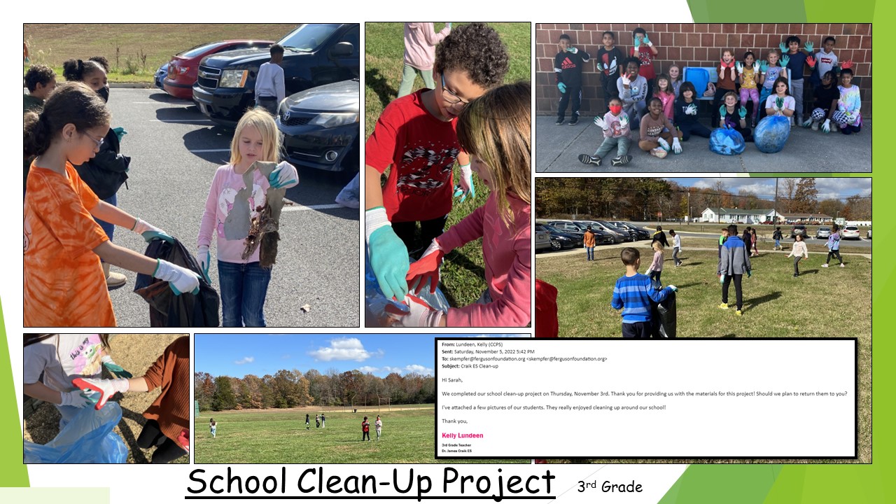 The Alice Ferguson Foundation continues to support our green efforts at school. On November 3, 2022, the Alice Ferguson Foundation provided supplies to our 3rd grade students to complete a School Clean-Up Project. The Alice Ferguson Foundation provided 3rd graders with gloves and trash bags. The students used these supplies and cleaned up around our school environment.