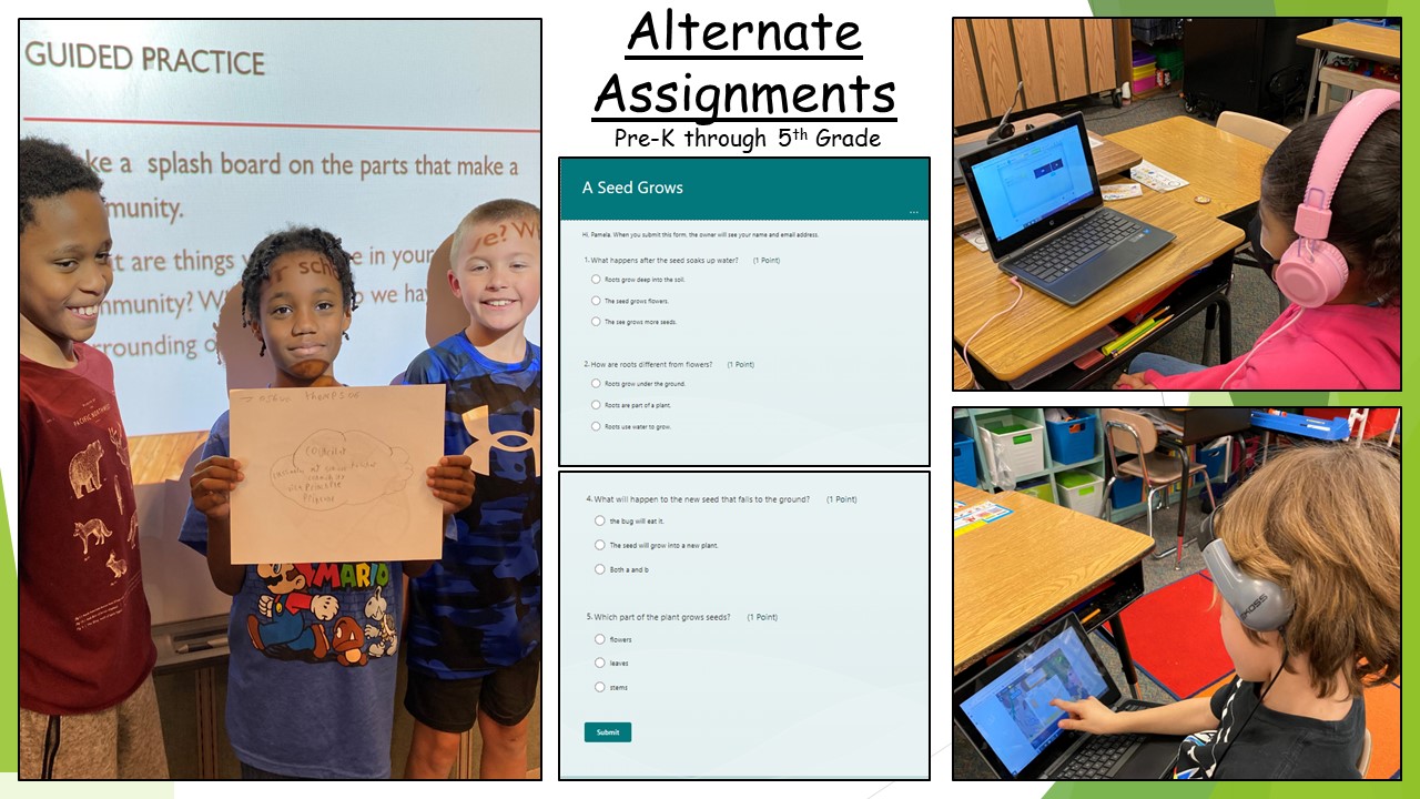 Teachers are encouraged to provide alternate options of independent seatwork rather than paper packets. Students can now digitally turn in assignments or complete assignments on the educational websites and student portals. When paper copies are needed, students and teachers utilize both sides of the document. Students work collaboratively on assignments to present and demonstrate their learning. All students in grades Pre-K to 5th complete alternate types of assignments.