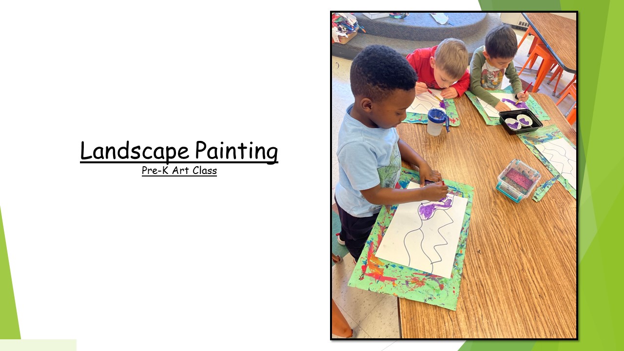 Students in the Pre-K class studied landscapes and the shapes, lines and forms found in landscapes. They identified earth features found in landscapes. Students used what they learned in Art class and the examples they were shown to draw their own landscapes.