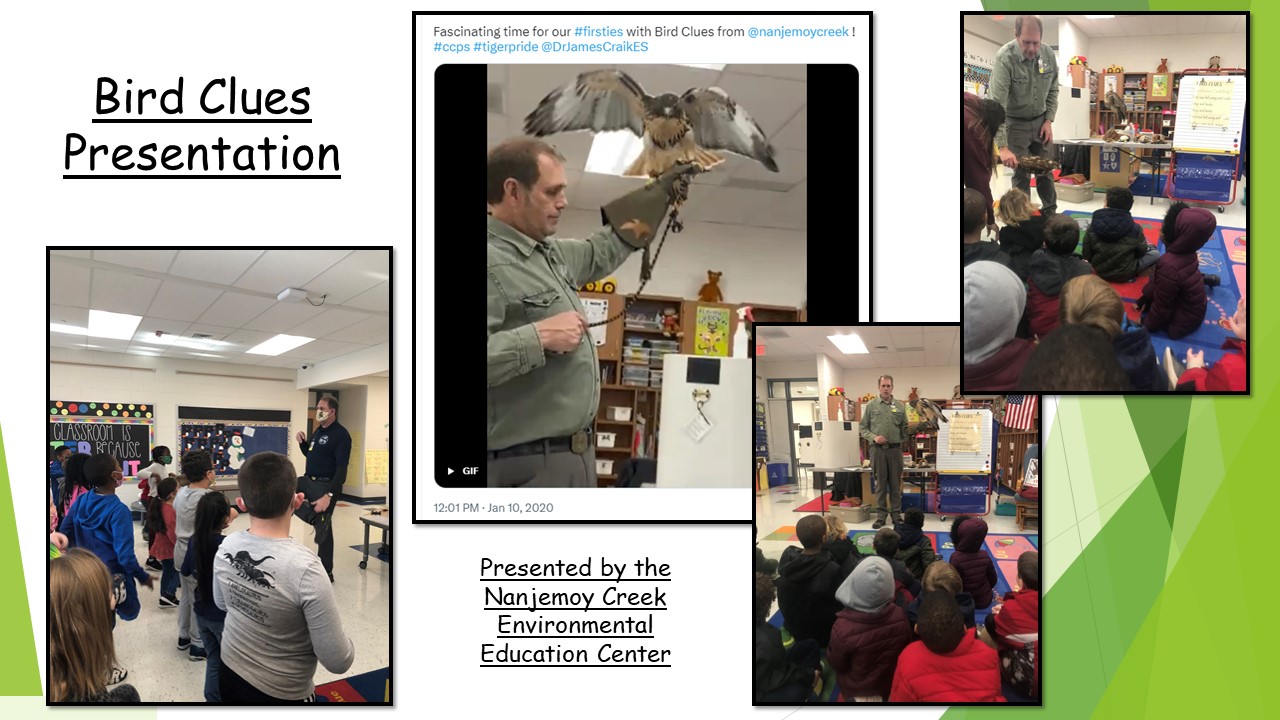Each year, students in 1st grade get to participate in the Bird Clues presentation by Nanjemoy Creek Environmental Education Center. January 10, 2020- 93 first graders attended the presentation and January 24, 2022- 82 first graders attended the presentation.