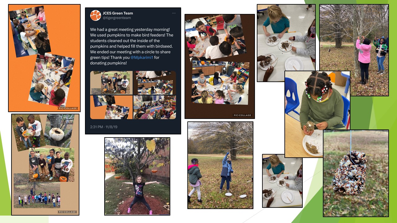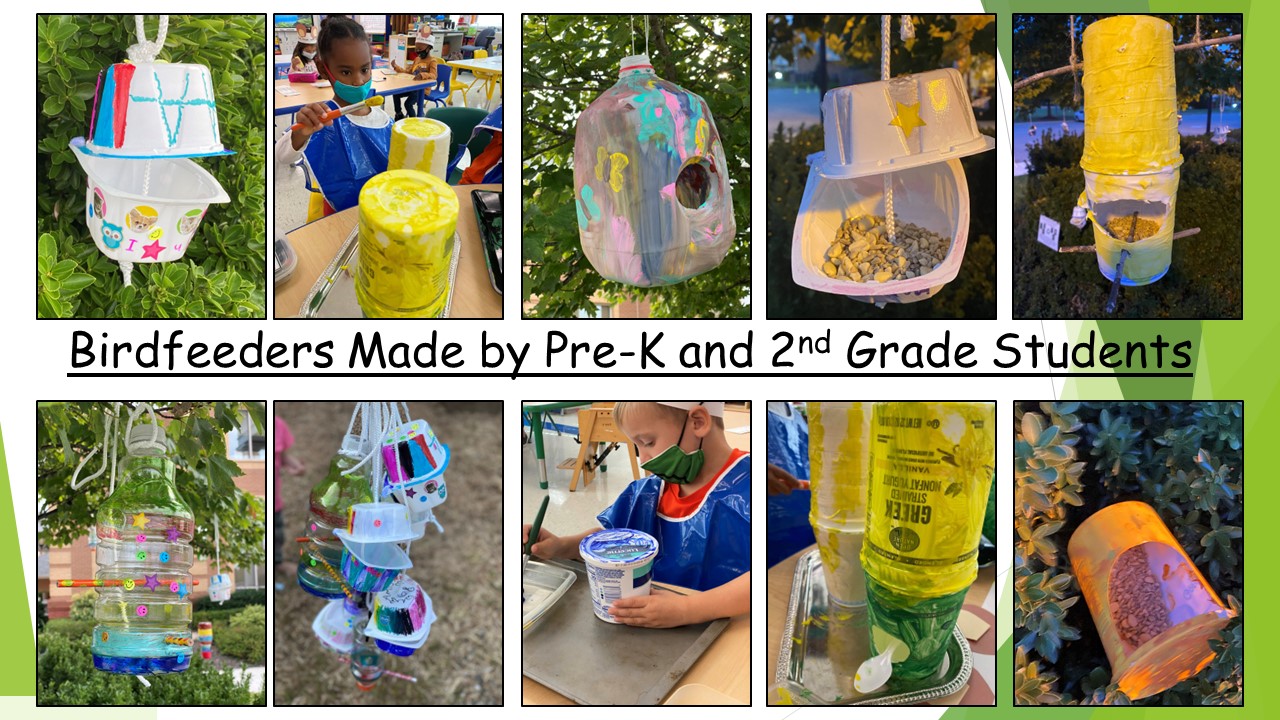 In October 2021, Students in Pre-K and 2nd grade reused items such as milk jugs, cereal bowls, containers, water bottles and spoons to make birdfeeders. 87 students combined from Pre-K and 2nd grade participated in this project.
