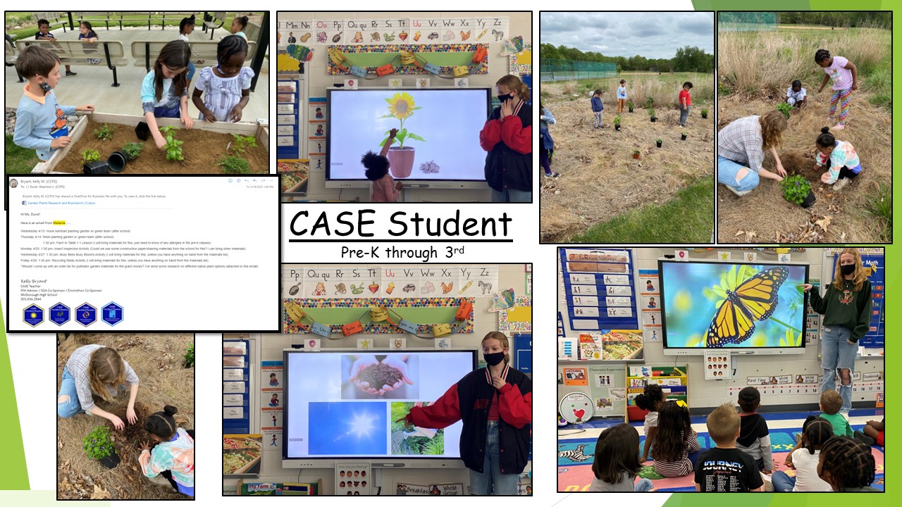 This photo shows the CASE student teaching lessons to our Pre-K students and starting the butterfly garden with our Tiger Green Team. Our school partnered with the CASE (Curriculum for Agricultural and Science Education) program within our county. Students from the CASE program came to our school to read agricultural and environmental stories and teach lessons about the environment. Our Pre-K students participated in environmental lessons and projects with assistance from the CASE students.
