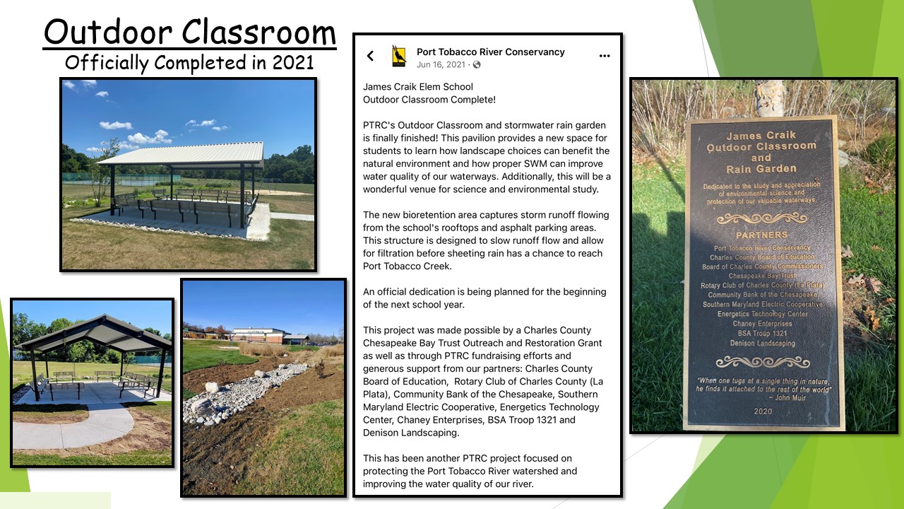 The Port Tobacco River Conservancy reached out to us in January of 2017 with a Grant Proposal to help design, plan and construct an outdoor classroom. Leading up to our last recertification year, they hosted fundraisers to raise funds for the outdoor classroom. During this recertification period, the PTRC coordinated the completion of the outdoor classroom and collaborated with their partners to finalize the project.