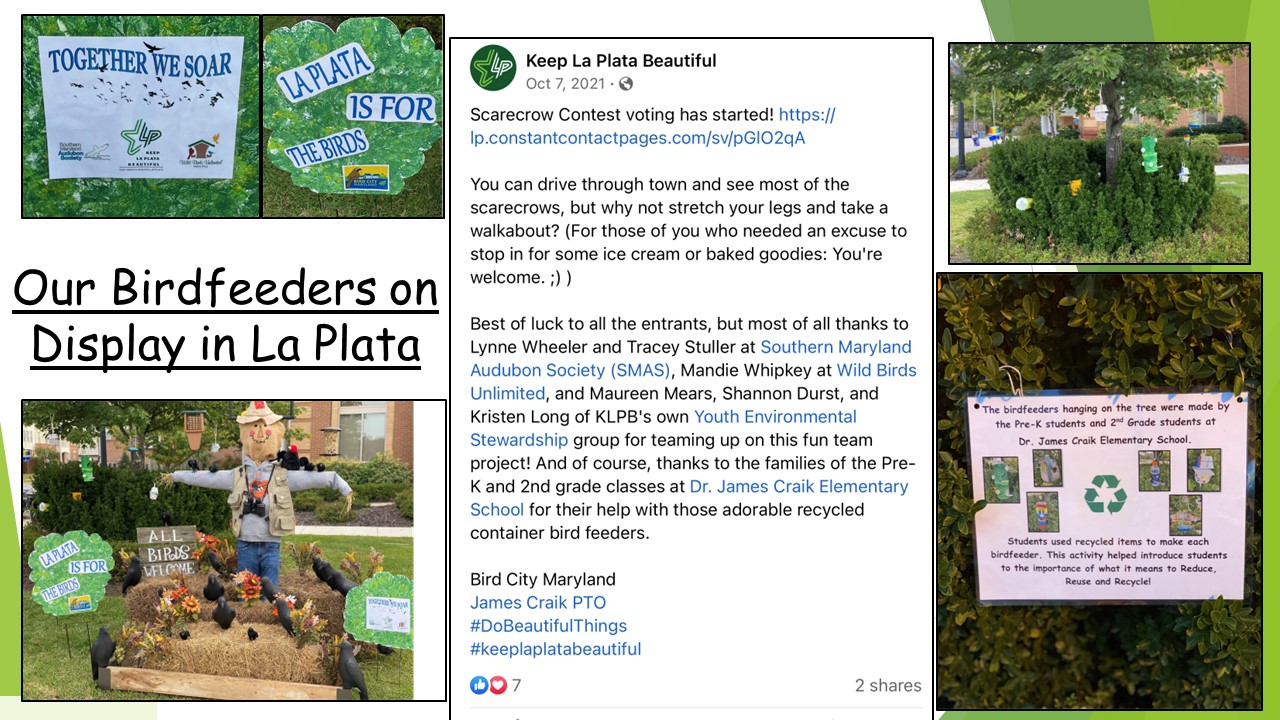 In October 2021, Pre-K and 2nd grade students (87 students total) at our school participated in creating birdfeeders made out of recycled materials to be hung out on trees outside of La Plata's Town Hall. On October 3, 2021, the birdfeeders made by the students at our school were added to the scarecrow display at La Plata Town Hall. Students learned about recycling and reusing items for a different purpose. The display was constructed by the Keep La Plata Beautiful Youth Environmental Stewardship group, Wild Birds Unlimited, and The Southern Maryland Audubon Society.