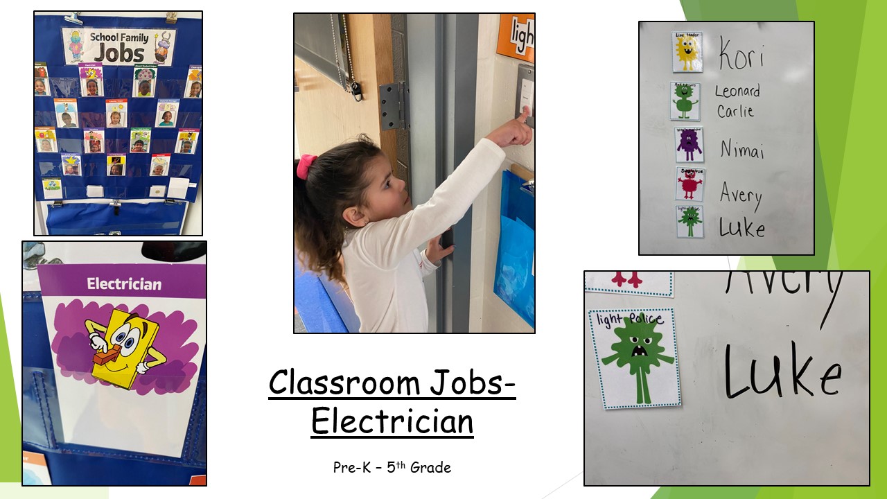 Pre-K and Kindergarten classrooms have light monitors/electricians as part of their classroom jobs. The Pre-K and kindergarten classrooms have the capability to turn the lights on and off, as well as, open and close blinds as needed. While the lights do have an automatic sensor, students have the job to turn the lights on and off as needed. On days when the natural light is bright enough, the "electrician/light monitor" will turn off or dim the lights in order to save electricity. In addition to turning lights on and off, classrooms without light switches utilize the electrician job to turn the Smartboards on and off as needed.