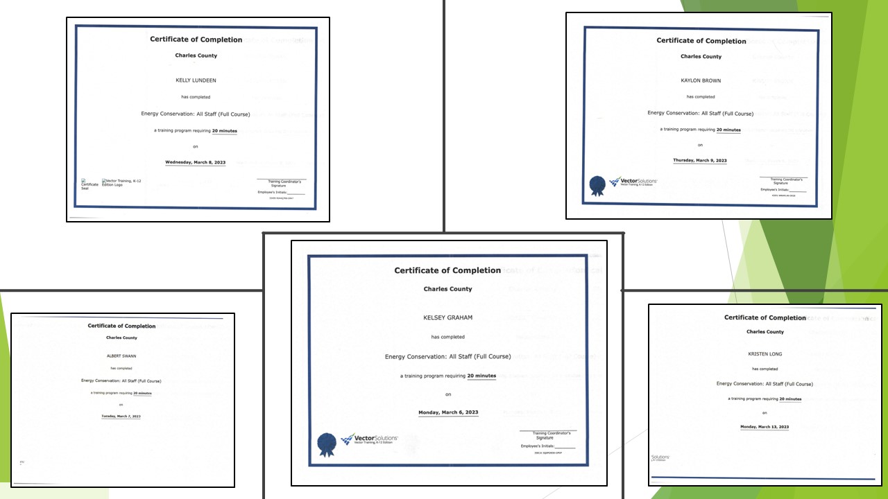 One course was Energy Conservation. The Goal of this course was to familiarize all staff members with information about energy consumption and costs, along with ways to make energy use less expensive. This course will cover the differences between energy use in your home and at work, the basics of heating and cooling rooms, and smart energy-saving strategies for all staff.