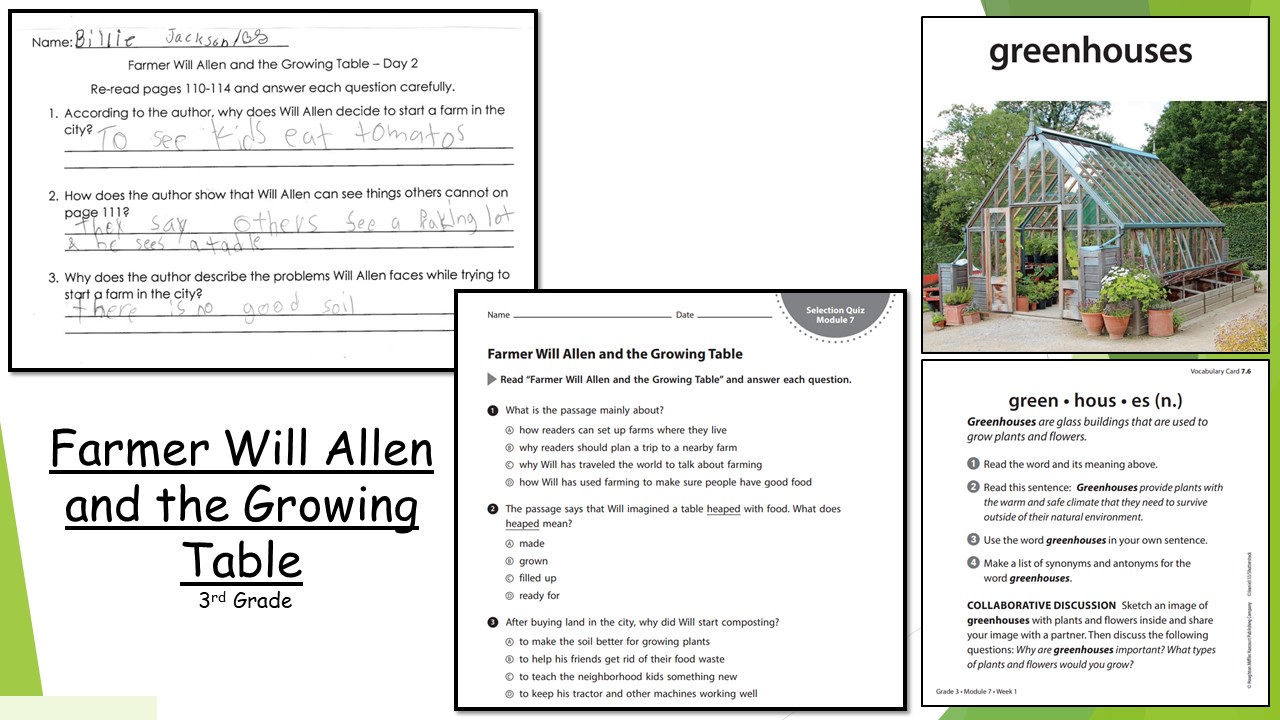 3rd grade students participated in a field trip to Hard Bargain Farm. On their trip, they learned about red wriggler worms. They took their new knowledge about red wriggler worms and applied it to their Farmer Will Allen lesson. They read Farmer Will Allen and the Growing Table and used their knowledge of red wiggler worms to talk about compost and how those worms can help with compost. The story introduced students to soil.