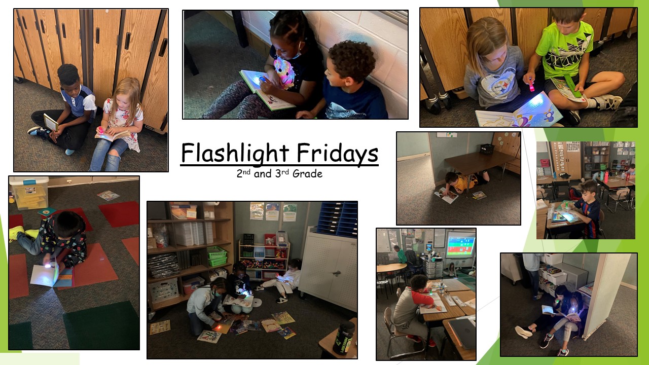Students in 2nd and 3rd grade participate in Flashlight Fridays. During Flashlight Fridays, the classroom lights are turned off and students are provided with small flashlights to use to read and complete their assignments. Our school building as limited natural light, so flashlights must be used to provide some sort of energy reduction.
