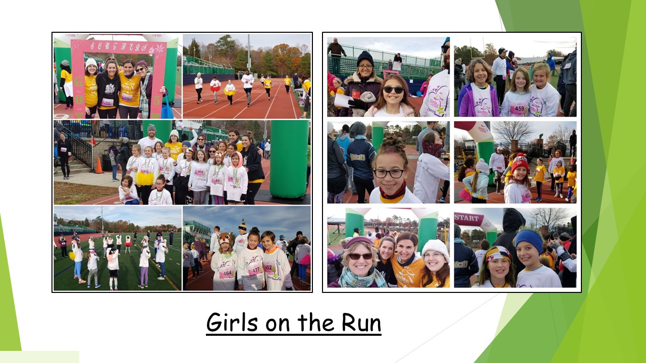 Our school participated in the Girls on the Run program. The team consisted of staff, students and parents. During their time on the team, coaches helped prepare the girls to run a 5K while working to strengthen their confidence and to understand the important connection between physical and emotional health. The team met weekly to discuss the importance of exercise and how to stay healthy. 14 students participated.