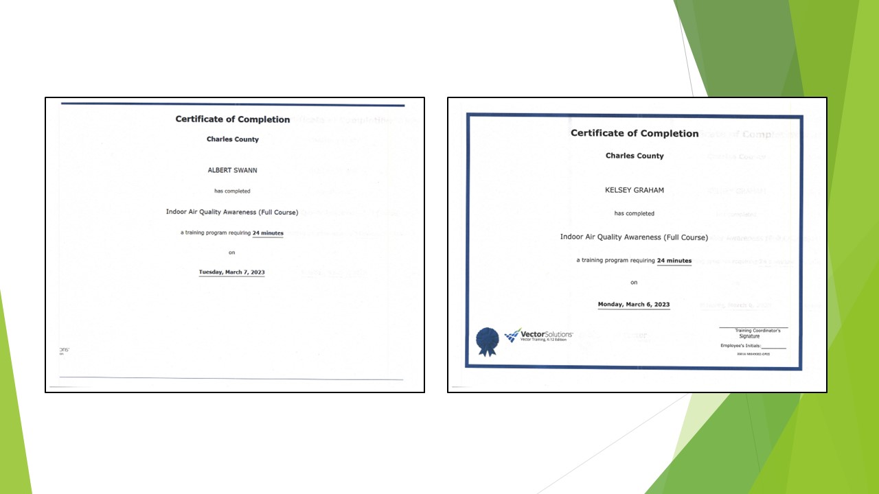 One course was Indoor Air Quality Awareness. This course provides staff with an understanding of the issues surrounding indoor air quality, including the adverse effects of poor IAQ, and some helpful practices for improving the indoor air quality in your facility. The course will review the impact of poor air quality, common indoor air pollutants, and essential good practices.