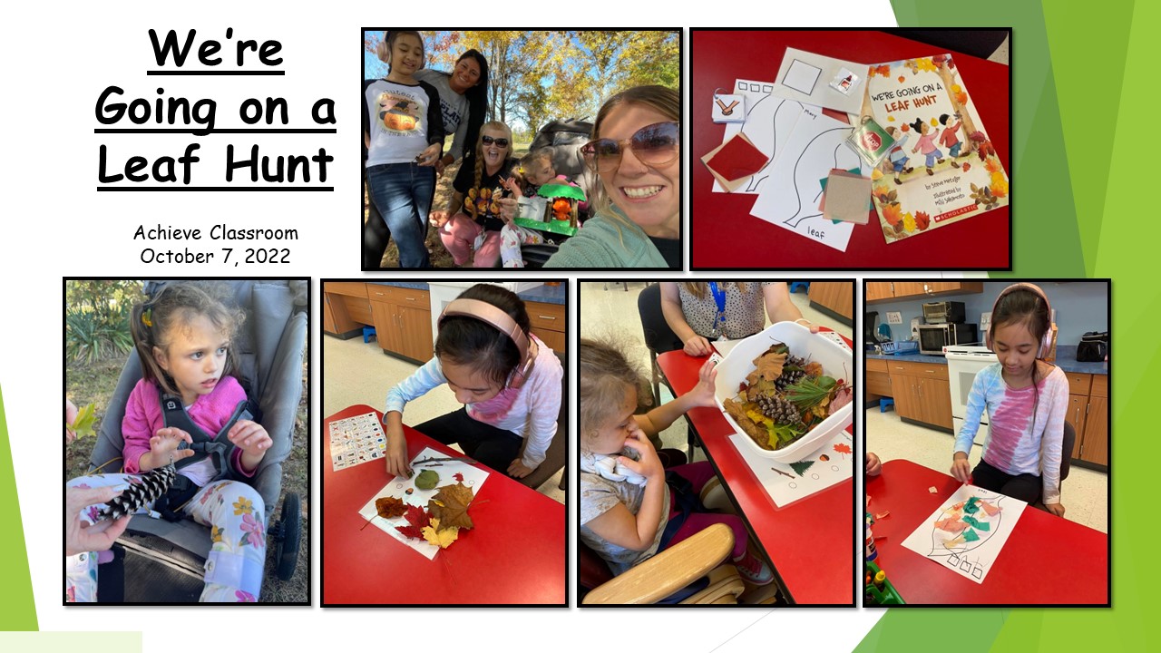 Students read the story, We're Going on a Leaf Hunt by: Steve Metzger. After reading the story, students went on their own leaf hunt. They used what they found outside to have a scavenger hunt and match items. They also used what they found and made a sensory bin. They explored the different color leaves and made their own leaf with tissue paper.