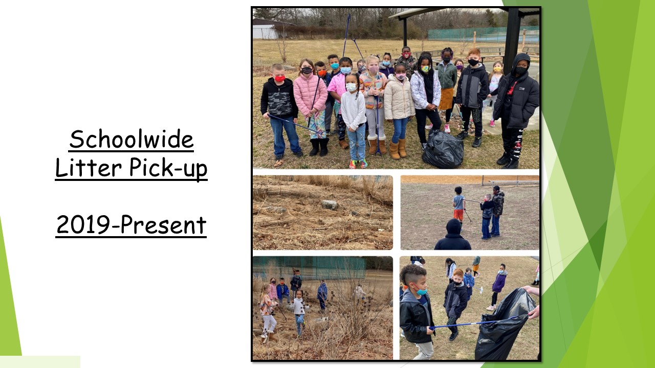 Grade: Pre-K-5 (519 students) During our monthly Tiger Green Team meetings, students monitor the school grounds and pick-up litter. Periodically, grade levels will pick-up litter during recess or other free times as they see needed. During the 2019-2020 school year, we picked up five bags of trash from the school yard. In the 2020-2021 school year, due to COVID restrictions and virtual/hybrid learning our students did not pick-up trash on the school grounds. When needed, staff members would remove trash found outside. During the 2021-2022 school year, we collected one bag of trash each month, totaling 10 trash bags for the school year. This year we have collected 4 bags of trash up to this point.