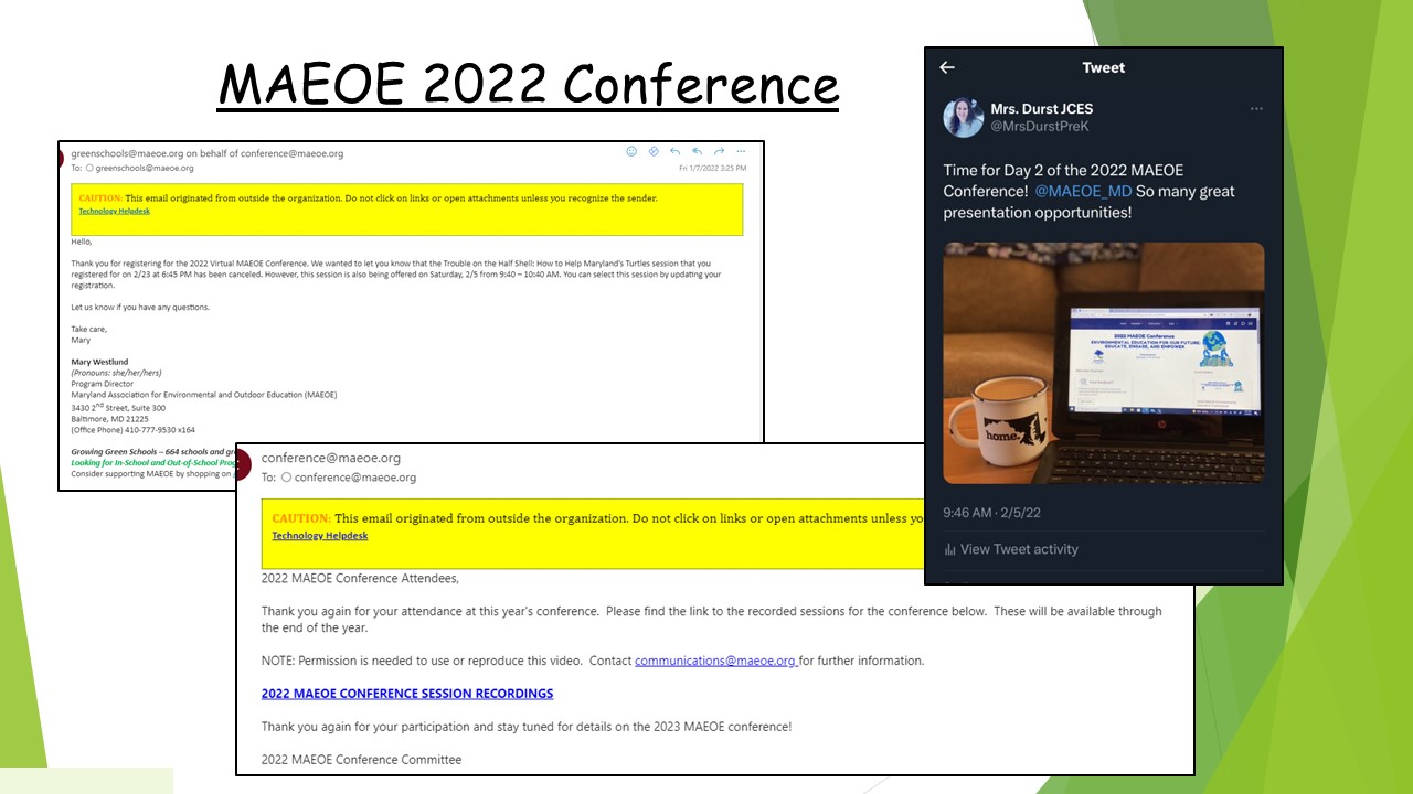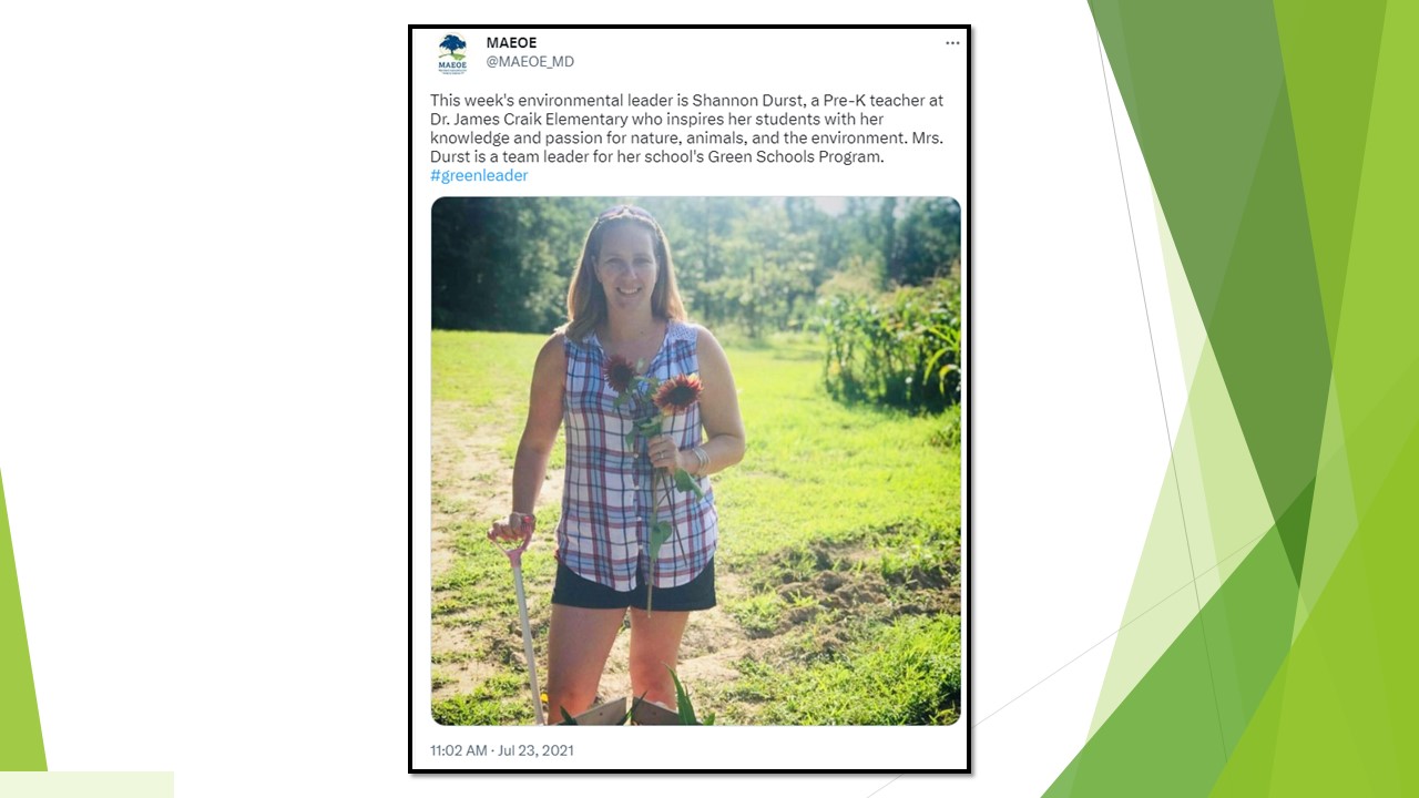 One of our staff members and Green School leaders was recognized online as an Environmental Leader by MAEOE.