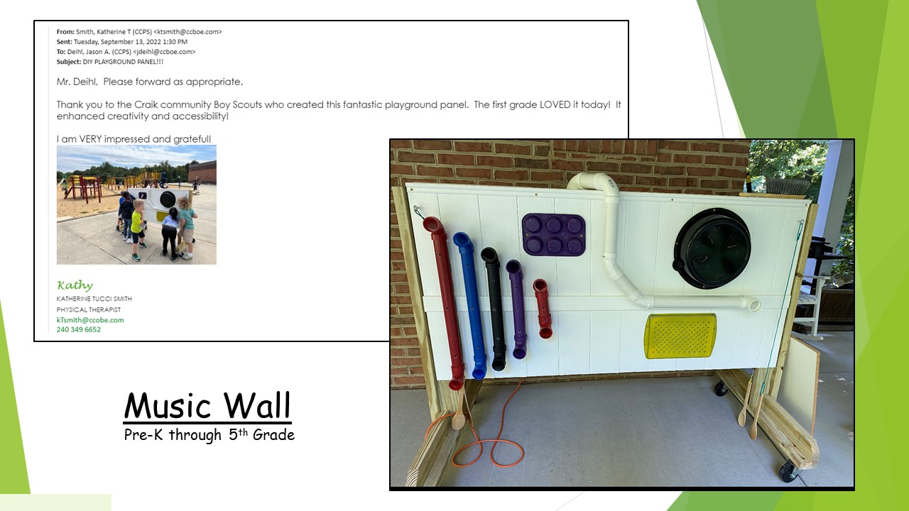 At the beginning of this school year, a local Boy Scout Troop #410 completed and dropped off a music wall. This music wall was added to our outdoor classroom area and students can use this wall while out at recess. Music classes also take advantage of using this wall. The wall was made by reusing items.