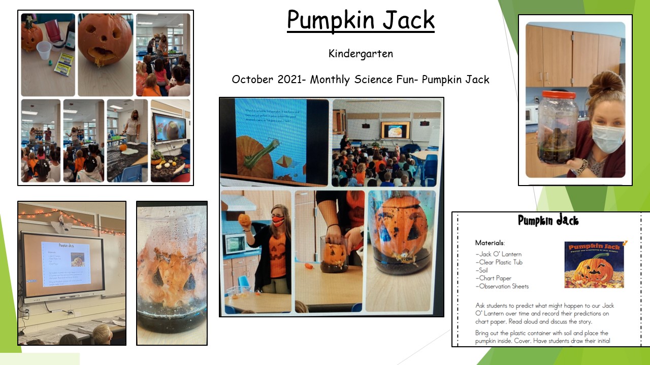 Students participated in the lesson Pumpkin Jack. This lesson introduced students to growing a pumpkin from the seeds in a pumpkin plant. Students listened to the book Pumpkin Jack by: Will Hubbell. They made predictions about what would happen to Pumpkin Jack overtime. Following the day of the lesson, students were able to make and record observations and what they noticed about their pumpkin in the jar. Students learned about the process of plant to seed. Students were able to visit the pumpkin every day to observe how the pumpkin decomposes and is transformed into several new plants. Before reading the story, students also learned about the life cycle of a pumpkin and were able to describe pumpkins.