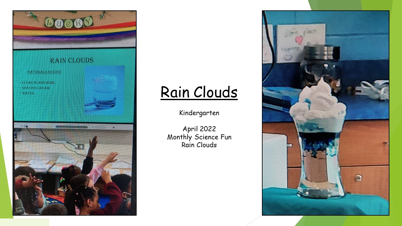 During April 2022, students participated in "Rain Clouds" as their monthly science fun. This fun science lesson helped students understand rain because as we all know, "April showers bring May flowers." Students learned how clouds form by retaining water and how water builds up in a cloud before raining. Students were also introduced to each season and compared the different types of weather that occur each season.