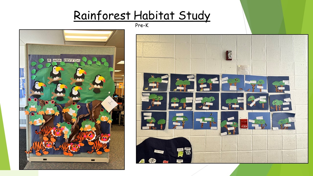 Students completed a unit on habitats. The Pre-K class learned about the different layers of the Rain Forest. They read Fiction as well as Non-Fiction books to identify the information that was true about the Rain Forest. Students then created a display to show what they learned about the Rain Forest. Students compared the Rain Forest habitat to other habitats in their natural environment.