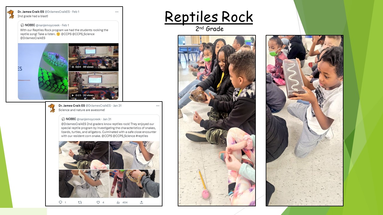 NCEEC visited our 2nd graders on January 31, 2023 to present Reptiles Rock. Students had the opportunity to investigate characteristics of reptiles found in our environment.