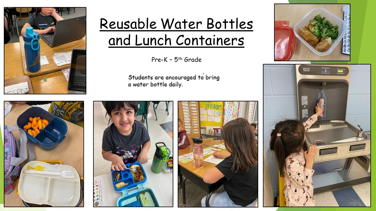 Students are encouraged to bring reusable water bottled and lunch containers to help cut down on waste at school. Teachers send reminders in their weekly emails or monthly newsletters. Students take advantage of Bi level green water cooler that is installed with a hydra-boost bottle filler to fill their water bottles.