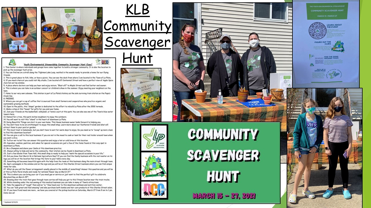 Staff and students from our school participated in the Keep La Plata Beautiful Scavenger Hunt. The scavenger hunt promoted healthy habits, provided "green" tips and encouraged participants to visit small, local businesses and parks within our community. 5 students from our school participated in the event.