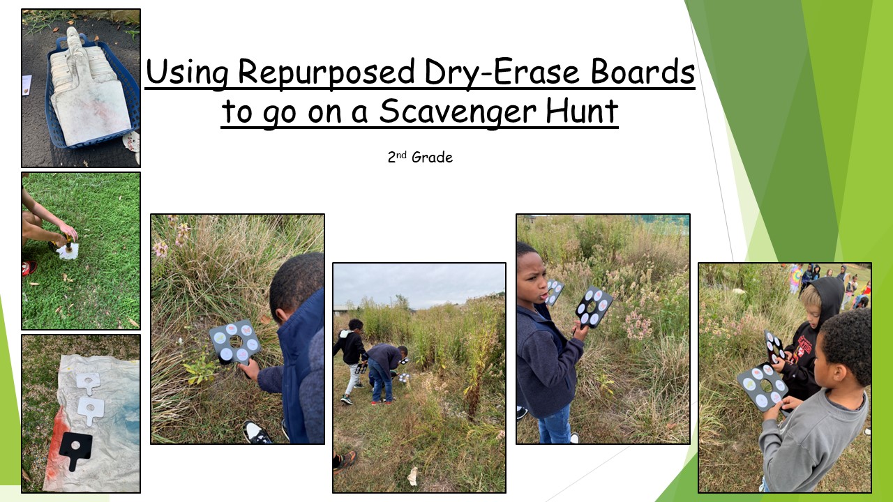 Students went on a scavenger hunt to find different plants, bugs, and greenery outside. Students were learning about different types of physical resources that are in the environment. They were able to use their finders to look through at the smaller animals and get close to the flowers. Students used "finders" that were made from old dry-erase paddle boards. The "finders" were created using repurposed dry-erase boards.