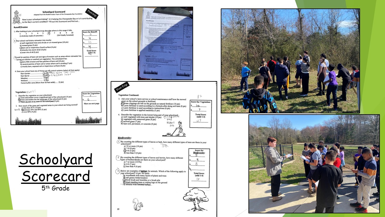 Students in the 5th grade classes learned how to be Watershed Stewards of our Schoolyard. They completed a Schoolyard Scorecard to see the condition and biodiversity of our schoolyard. They used a Google map to answer some of their questions. They completed this lesson using some of the information they learned on their field trip to Nanjemoy Creek.