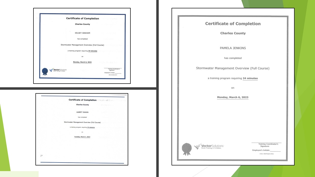 One course was Stormwater Management. This course gives employees an overview of storm water management issues, including storm water pollution, storm water management solutions, as well as the best management practices and more. It will review sources of storm water pollution and their effects on the environment, typical storm water management solutions, the best practices when seeking a "greener" or more natural solution to storm water issues, and policies and regulations surrounding the management of storm water.