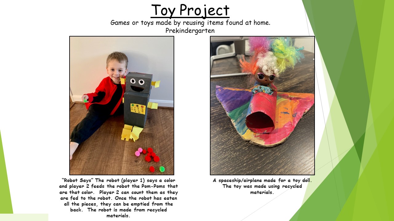 Students participated in lessons about what it means to recycle and reuse items in their environment to make something new. After completing their Unit: Our Environment, and reading books about recycling and how they can help the earth, students demonstrated their knowledge about reusing items and they made their own game or toy out of recycled items at home.
