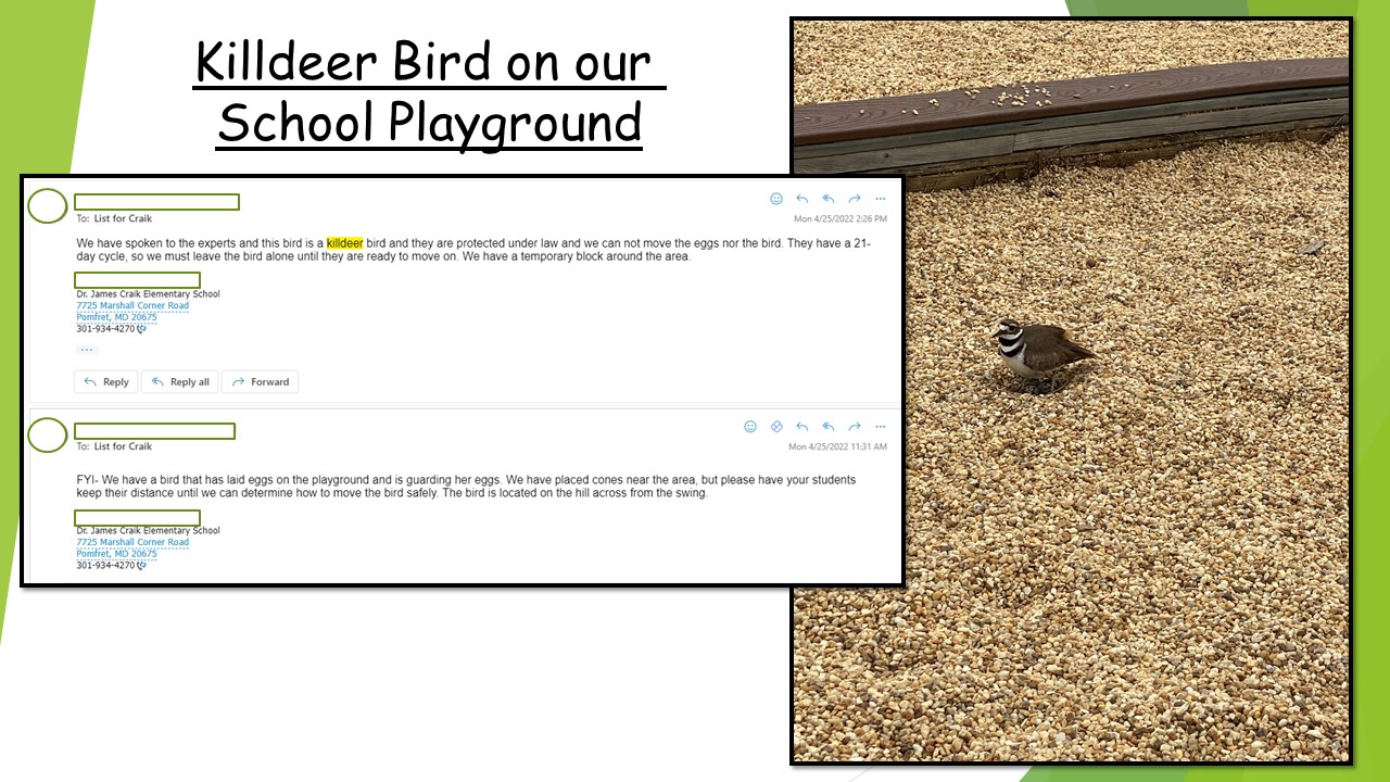 On April 25, 2022, a Killdeer bird made a nest on our school playground. This bird and their eggs are protected under law and their nest area must be protected. Our school roped off the area and teachers and students monitored the area while at recess. The bird remained on our playground for a few weeks and then not long after, another bird showed up. Classrooms took advantage of this bird visiting and did research to learn more about it. Many students showed interest in the Killdeer bird. 509 students worked together to protect the habitat of this bird.