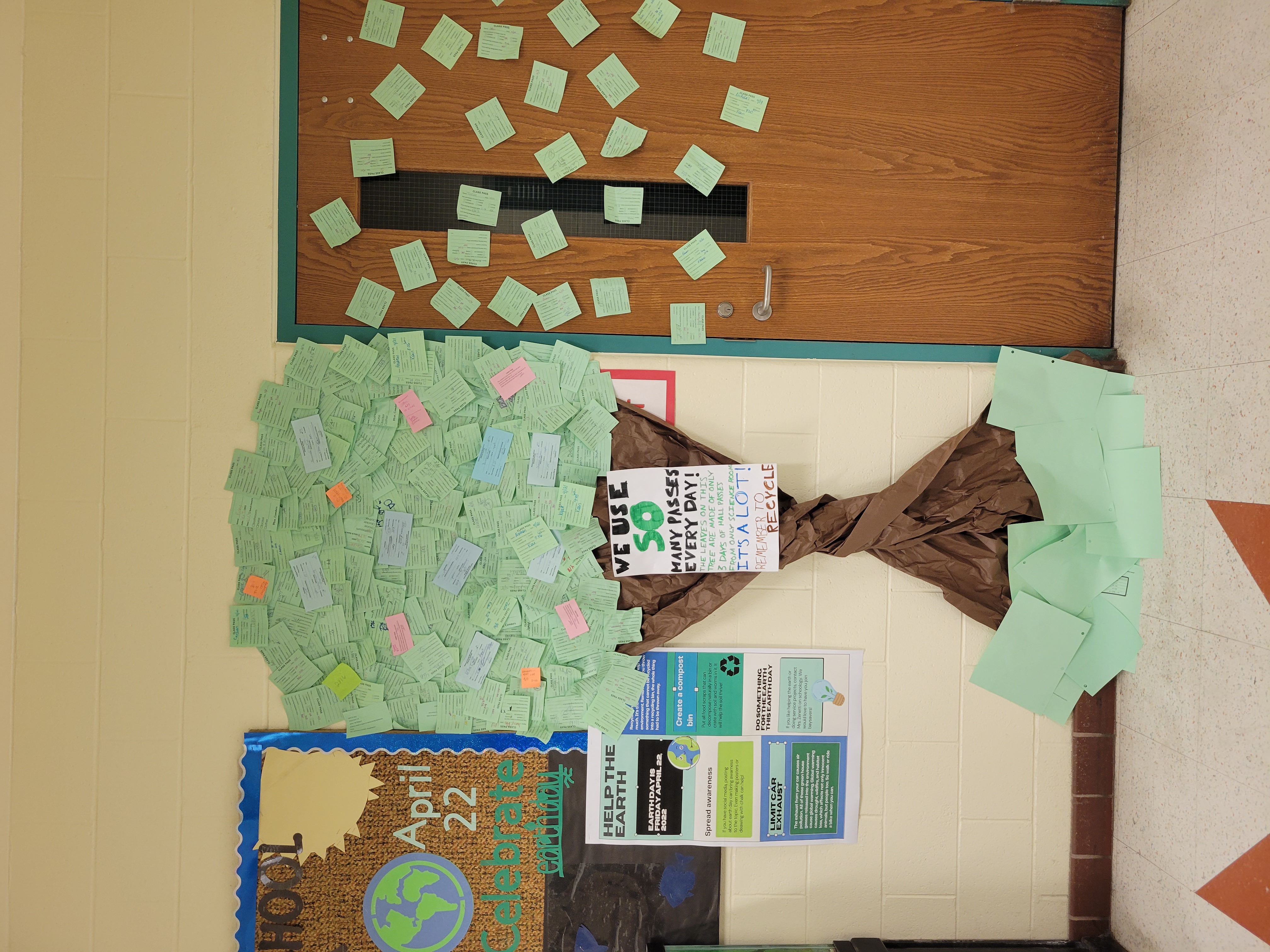 Students in the Bay Savers Club wanted to promote recycling hall passes during our celebration of Earth Day in 2022. Students placed various collection boxes in teachers’ classrooms to collect the used hall passes. Students created a morning announcement to explain and promote the activity. Once students collected enough passes, they created a tree mural out of the recycled hall passes. They also created a sign that said “We use so many passes every day! The leaves on this tree are made of only 3 days of hall passes from only science rooms. It’s a lot! Remember to recycle.”