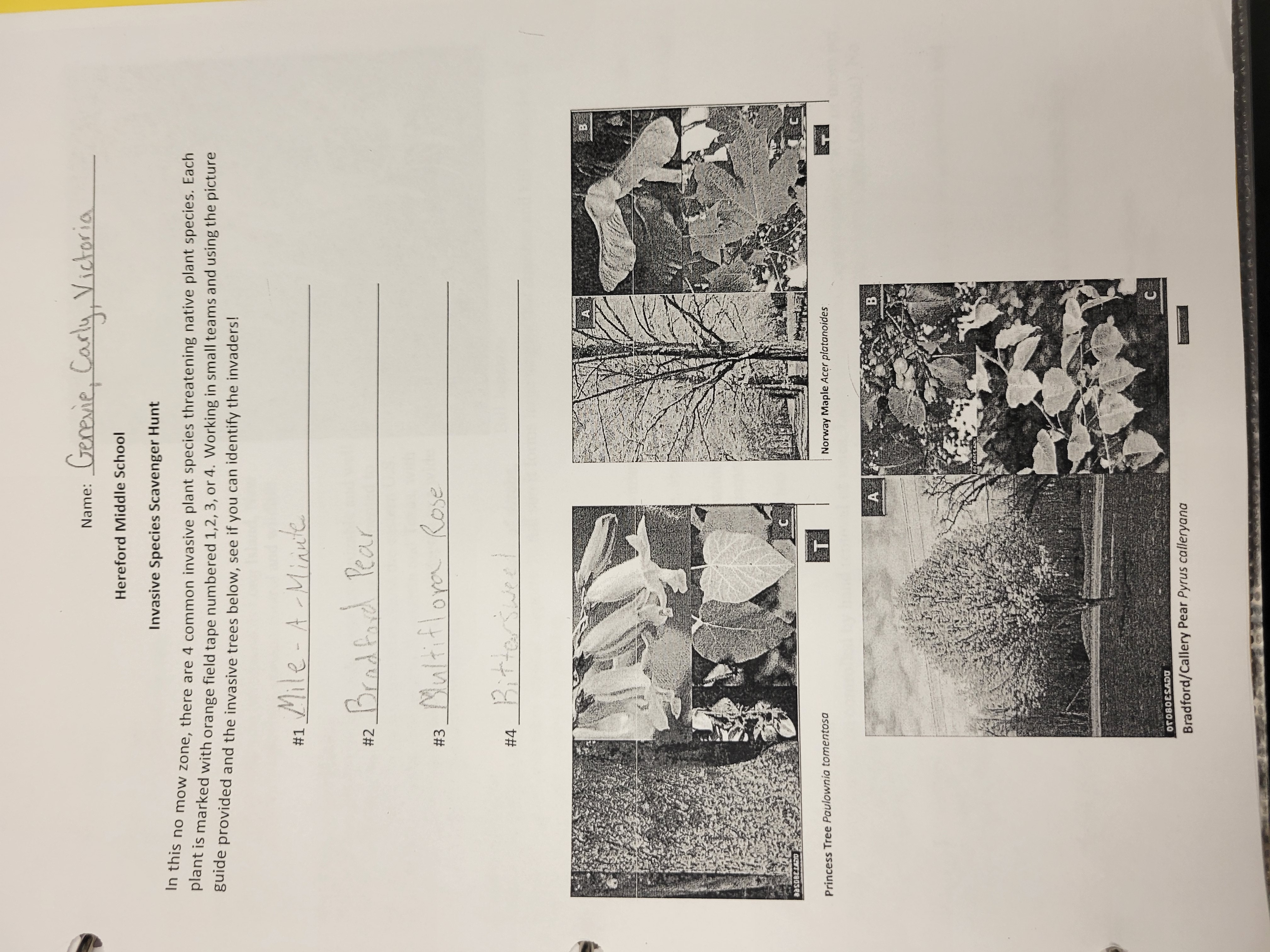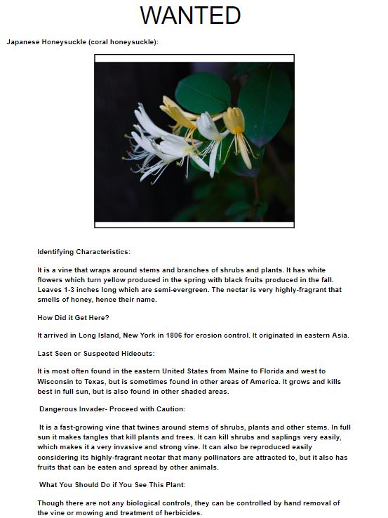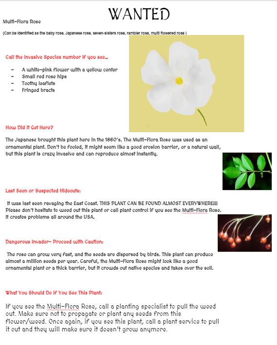 Students in 7th grade science completed a survey of plants growing around our schoolyard. Students used various apps to identify native and invasive plants. Students researched invasive plants to determine how they ended up in our ecosystem, the structures of the plants that allowed them to thrive within our ecosystem and how to remove them from our ecosystem. Students then created a wanted poster with their information to inform others about their selected invasive plant.