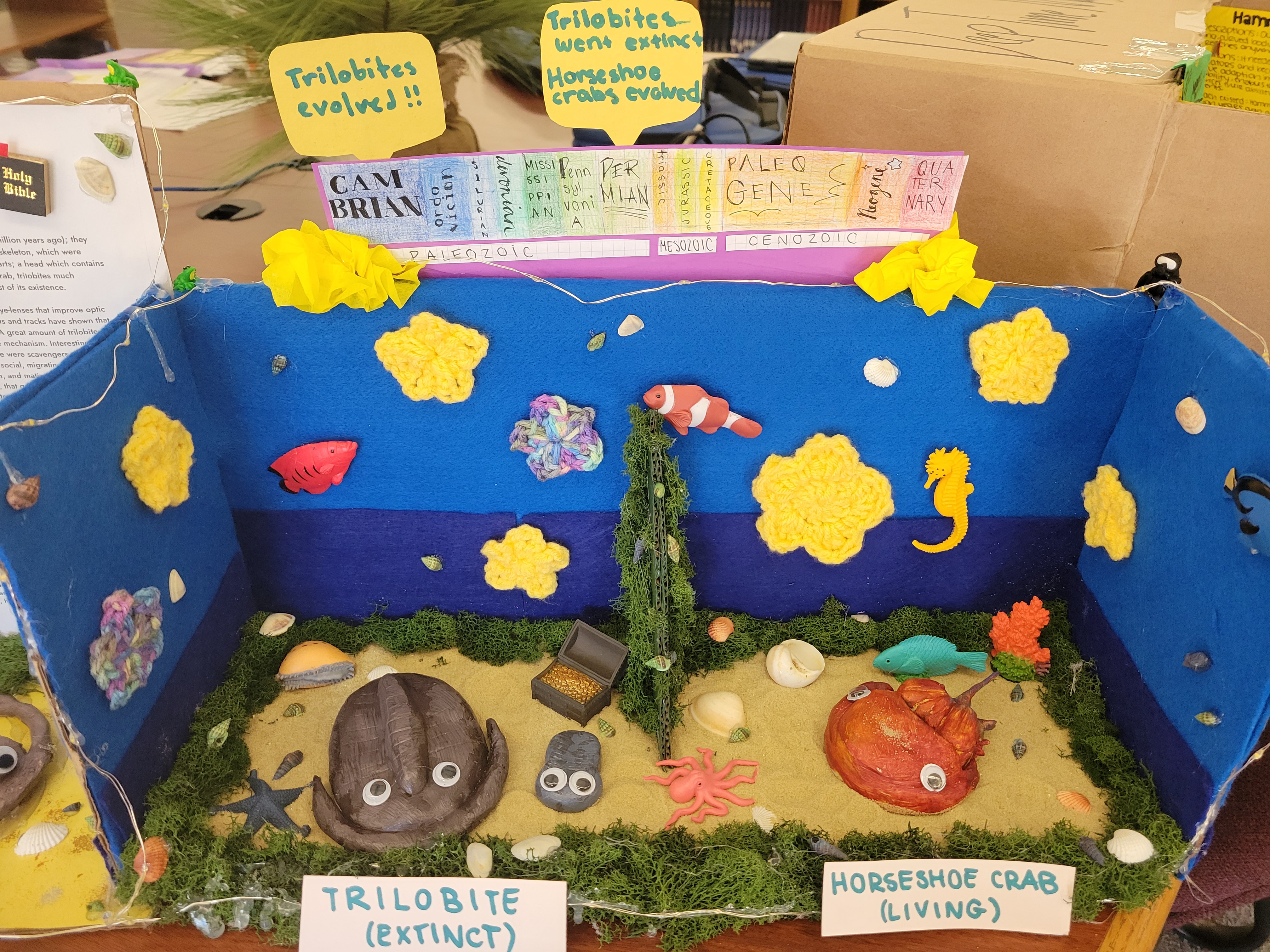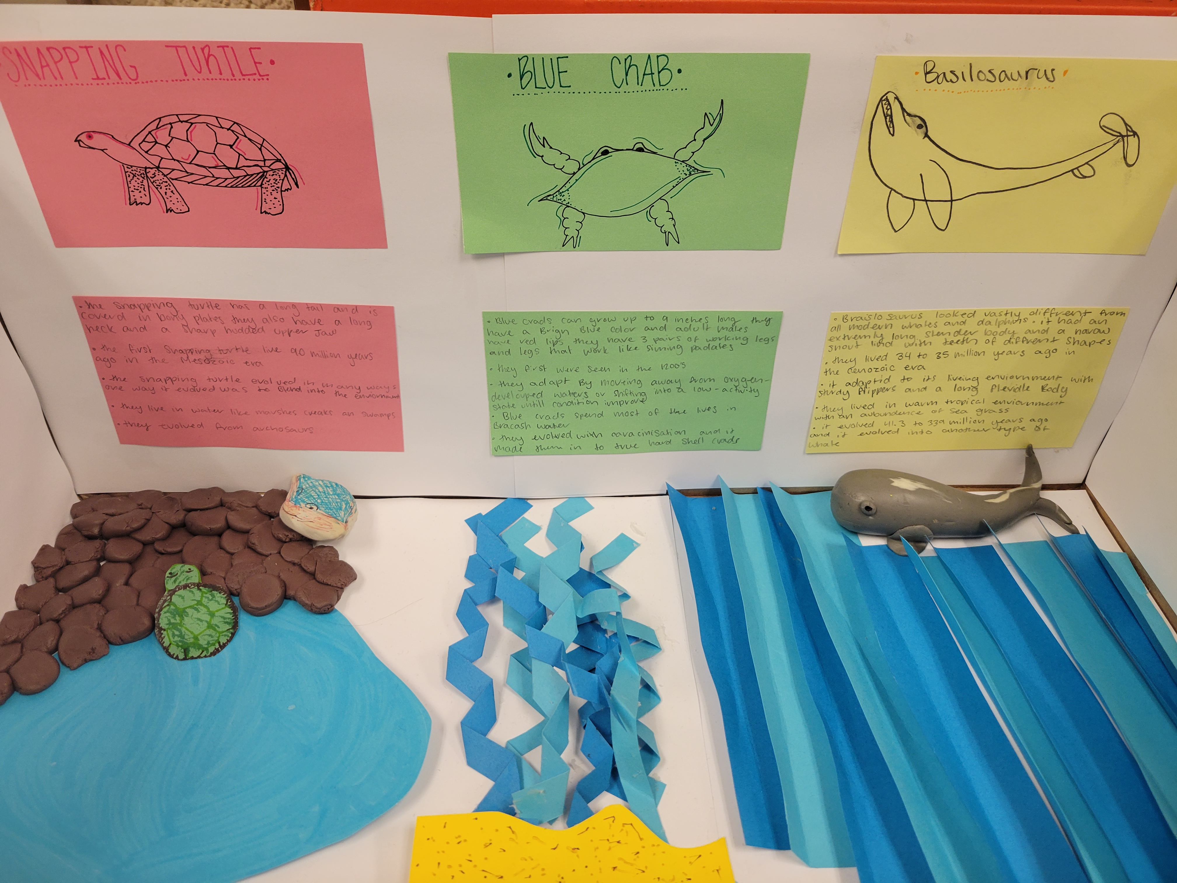Student dioramas for their "deep time" exhibit showcasing how the life forms in Maryland have changed over time.