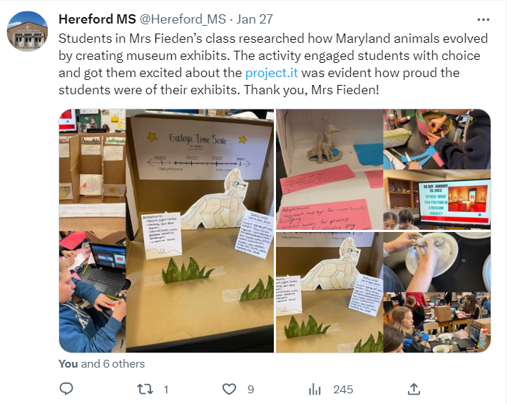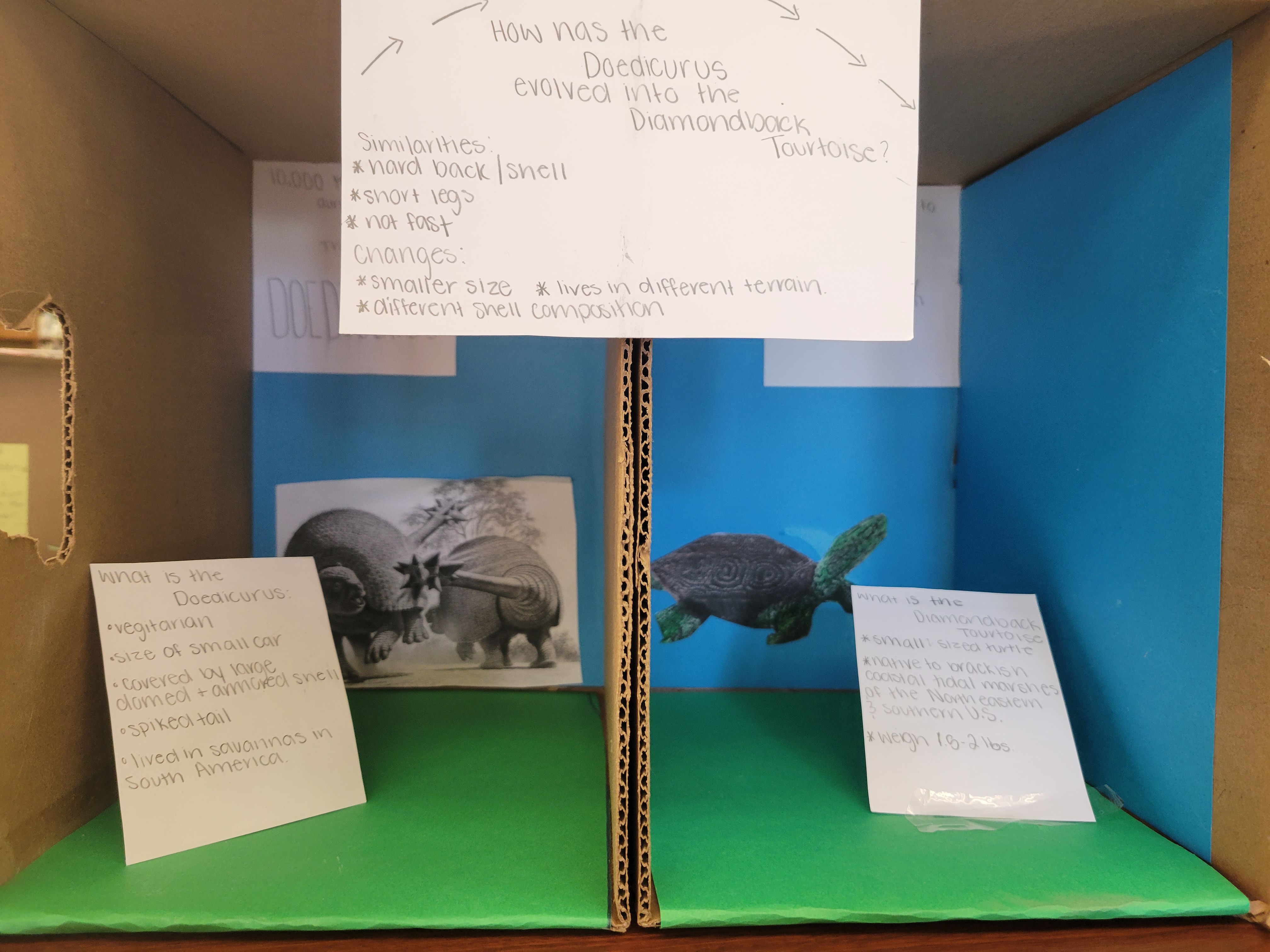 8th Grade students were tasked to design a new exhibit that could be used at the Maryland Science Center to transport visitors through Maryland's "deep time." The exhibit should help the visitors understand how the life forms in Maryland changed over time.